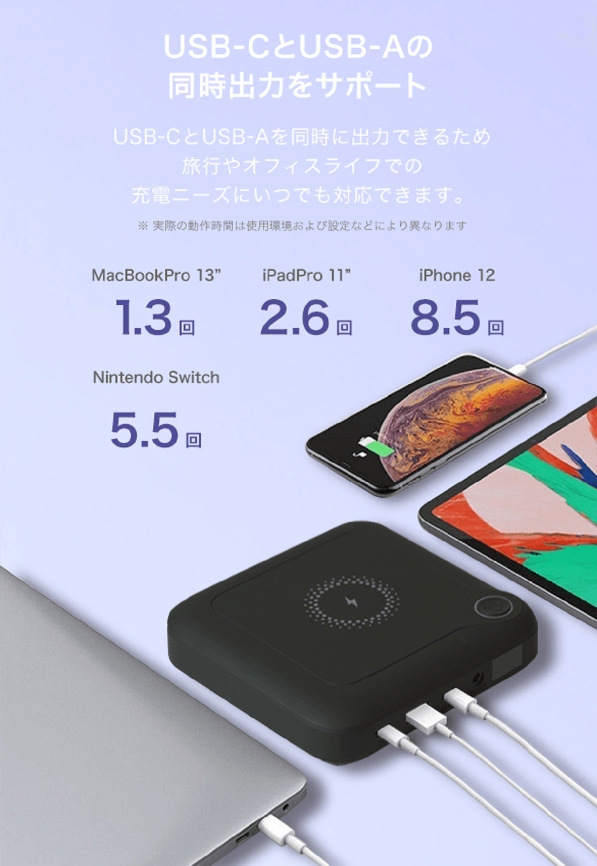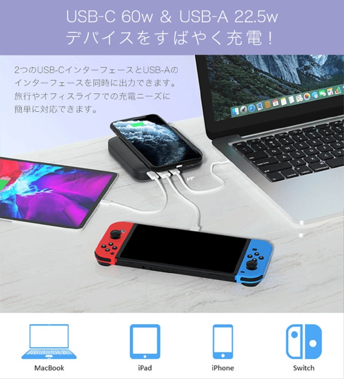 USB-CとUSB-A端子の同時出力も可能。2台のスマートフォンやマルチデバイスを同時チャージできます。市場需要の99%を満たすのを目指して、市場のほとんどのスマートフォンやラップトップの充電と互換性があります。