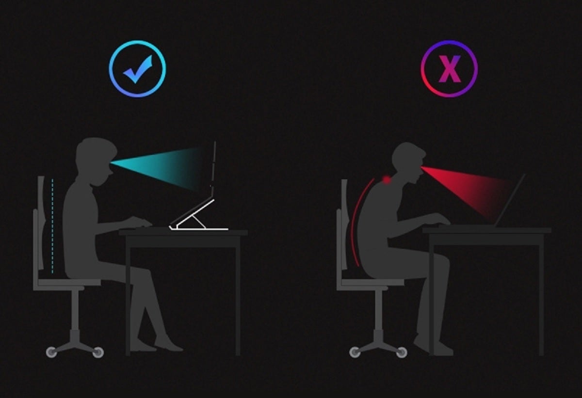 画面の高さを上げる事により、視線の高さ(頭部の高さ)が高くなり姿勢を是正、長時間作業の疲れを軽減します。↓