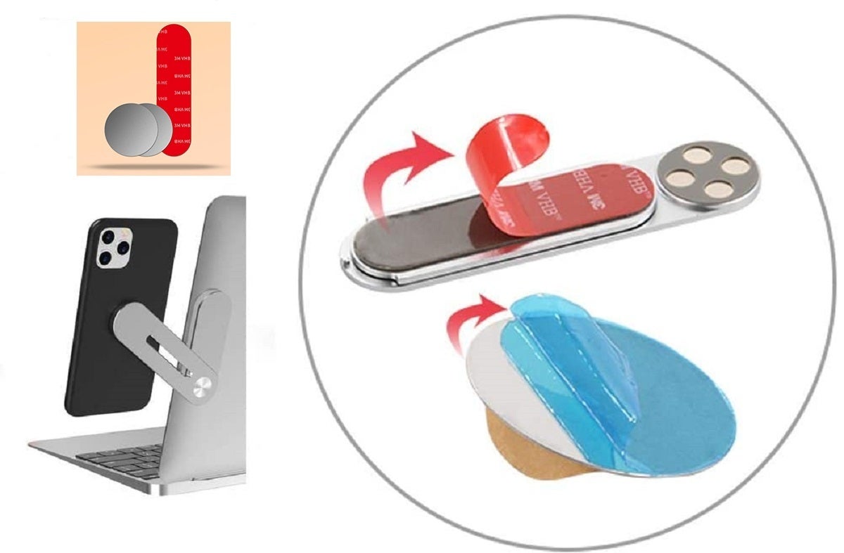 ラップトップ上 及び スマートフォン上双方に、同梱されている両面シールを用いて装着します。スマートフォンとホルダー間はマグネットで装着します。