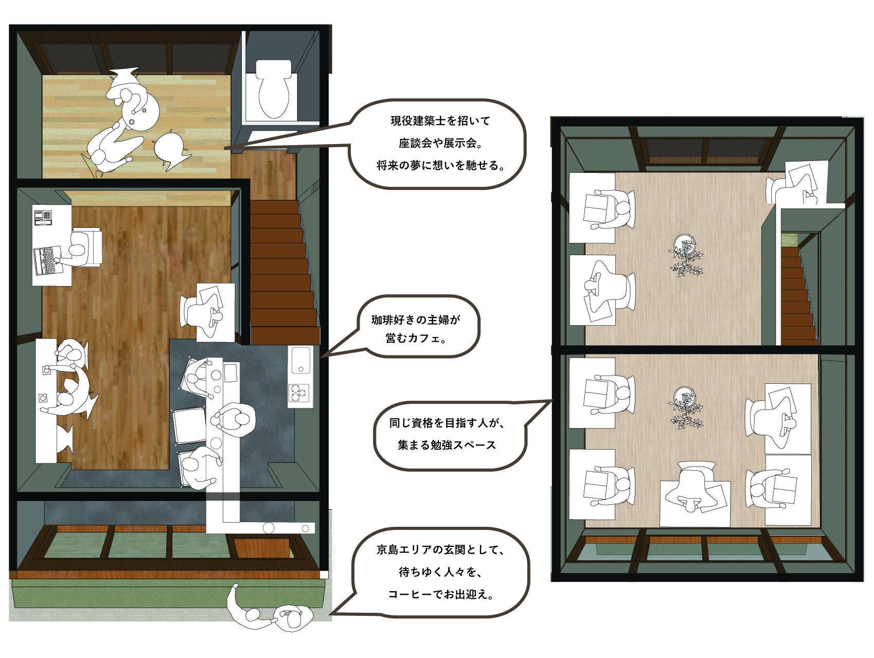 1階にはカフェ・展示スペース、2階には資格受験生向けの自習スペースを提供予定です。