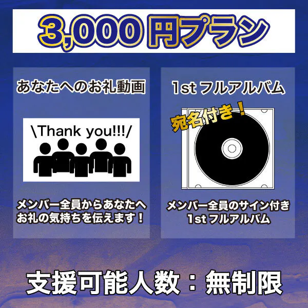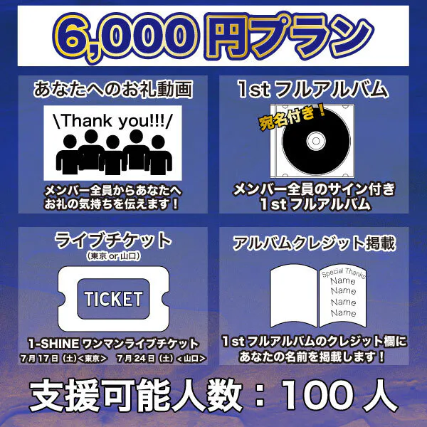 A:複数ご支援頂いた場合、『あなたへのお礼動画/楽屋ご招待/あなたのためのライブ実施/アルバム直接お届け』以外はご支援回数分リターンを提供させて頂きます。複数購入された場合はリターン権利の譲渡や販売は禁止されておりますのでご支援頂いたユーザー様のみが可能となっておりますので複数回分はご利用いただけません。