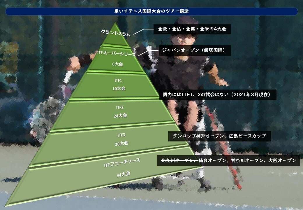 ITF(国際テニス連盟)が管轄する車いすテニスツアーは、UNIQLO WHEELCHAIR TENNIS TOURと呼ばれ、グランドスラム4大会を頂点とした6カテゴリのピラミッド構造からなっています。2019年には170大会が開催されました。