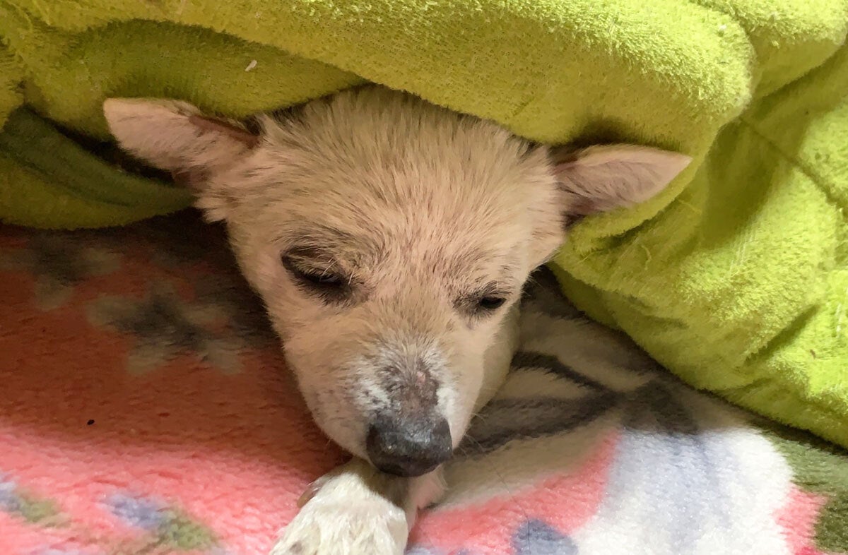 △ゴミ屋敷からのワンコ救出時に一緒に保護した剛ちゃん。傾いて歩いていたため、検査してもらうと脳腫瘍がありました。