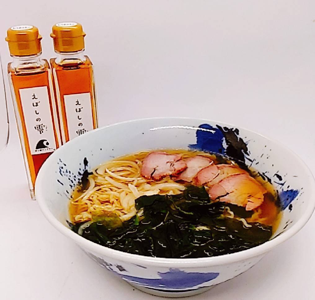 〇 えぼしの雫のだしから粉末にした「出汁の素」を合わせることで深みのあるスープとなっております。(スープまで飲み干せるラーメン)
