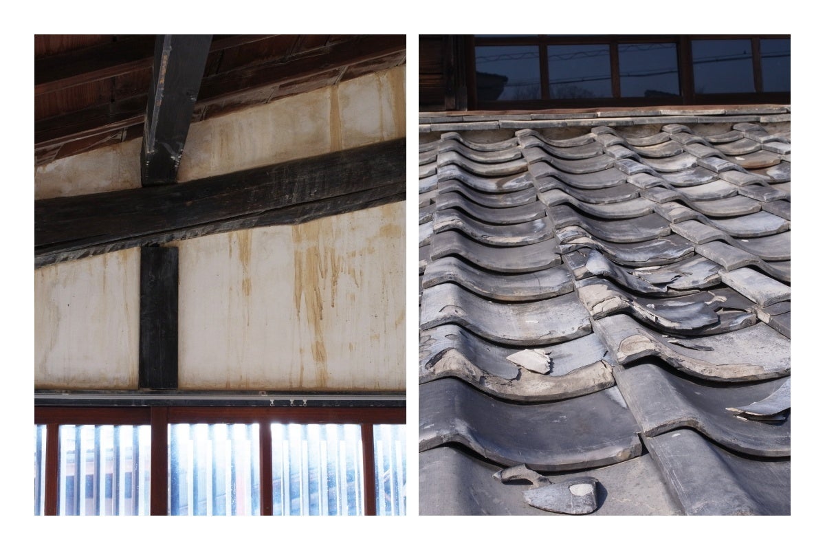 左が雨漏り。右は老朽化した瓦。