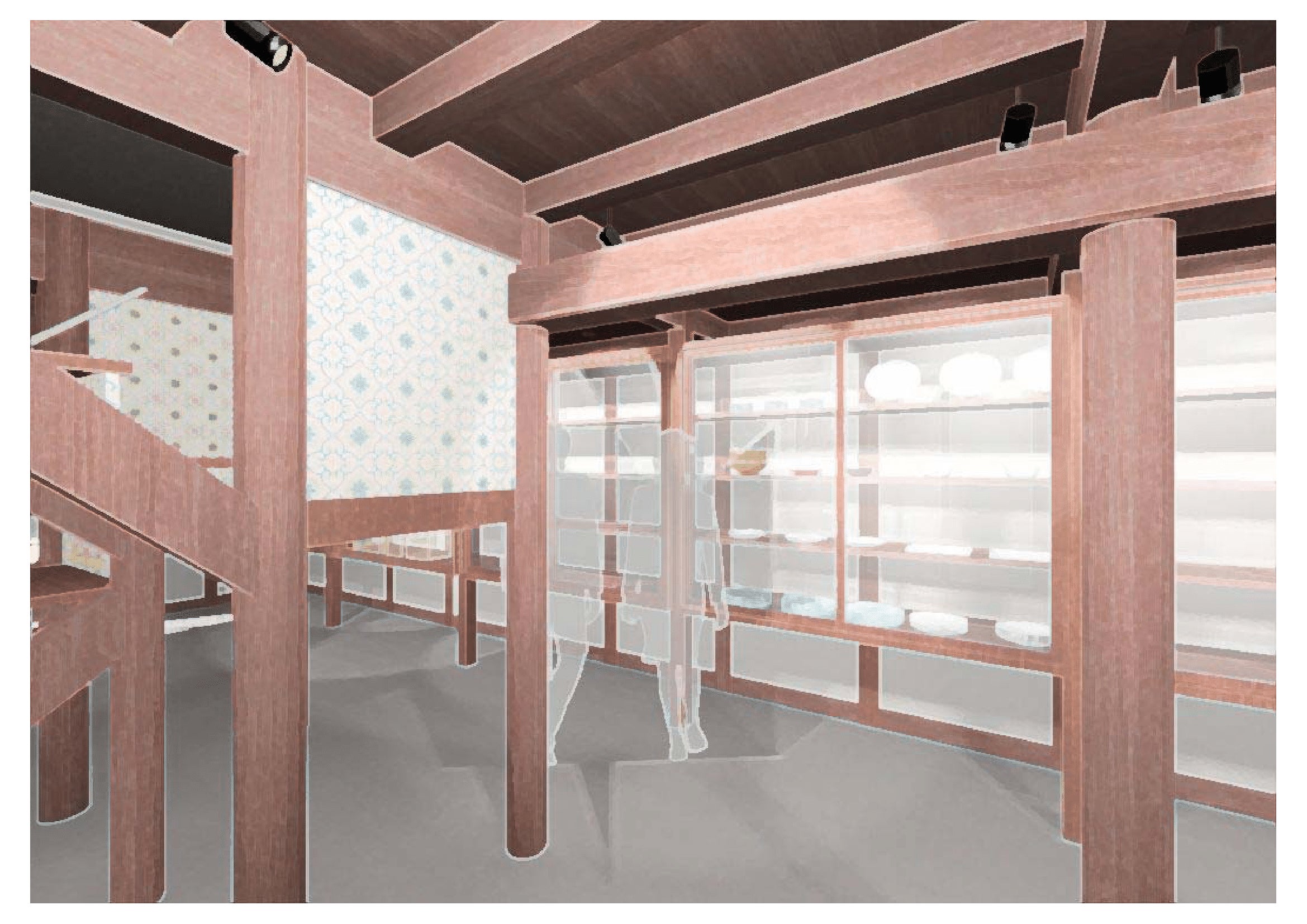 1階・展示スペースのパース。フロア中央には新たに階段を新設予定。