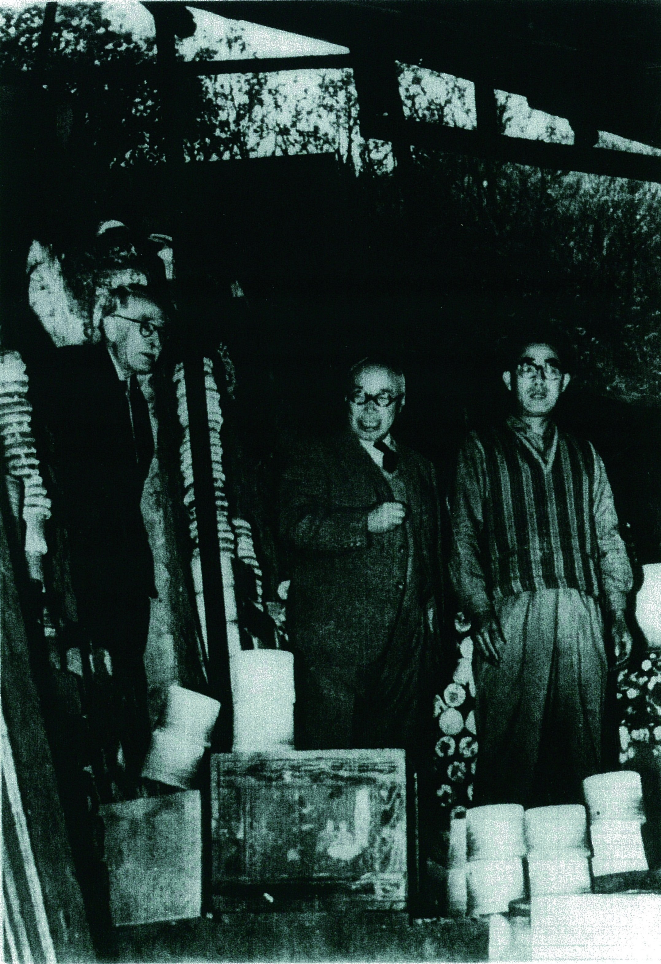 左からバーナード・リーチ、濱田庄司、祖父の六代目水野半次郎。