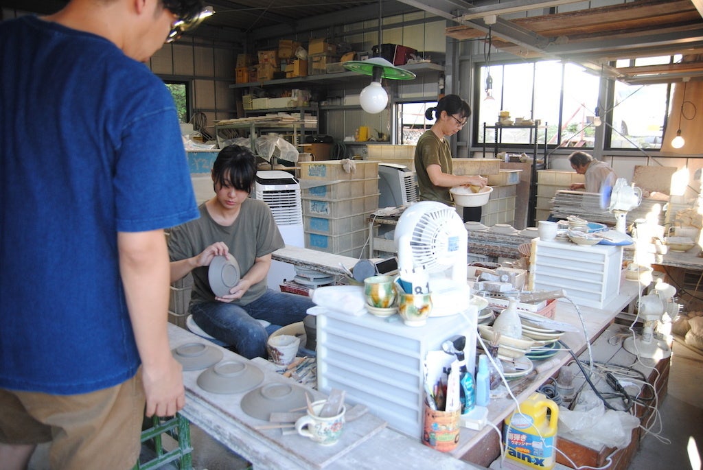 女性の職人が多い工房内の様子。しかし、ここは個人のいち窯元です。年間2万個から2万5000個のやきものを、粘土や釉薬にはじまるすべてを、従業員8名で手仕事でつくっています。