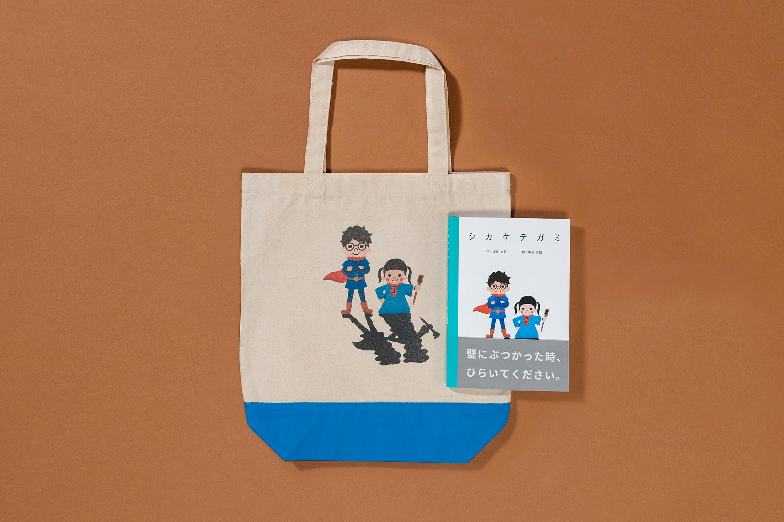 今回はリターンとしてこちらの商品をご用意しました。シカケテガミと電子データに加え、このプロジェクト限定のオリジナルトートバッグ(自分がつくった親子のキャラクターがプリントされた世界にひとつだけのトートバッグ)も準備しています。僕は子供の絵本や楽譜入れに使っているのですが、かなりの頻度で「それもしかしてパパと○○ちゃん?」なんて聞かれますよ!
