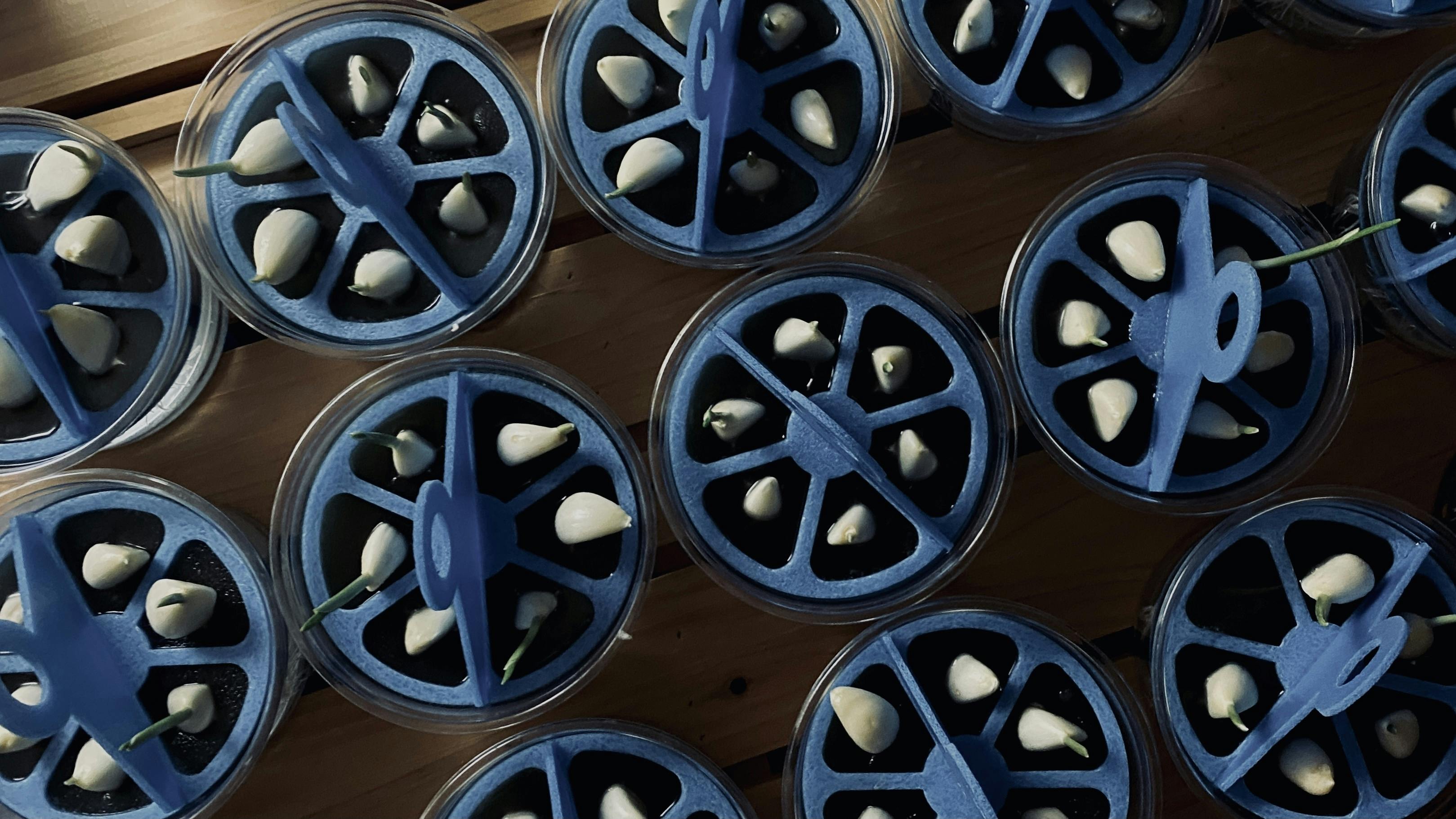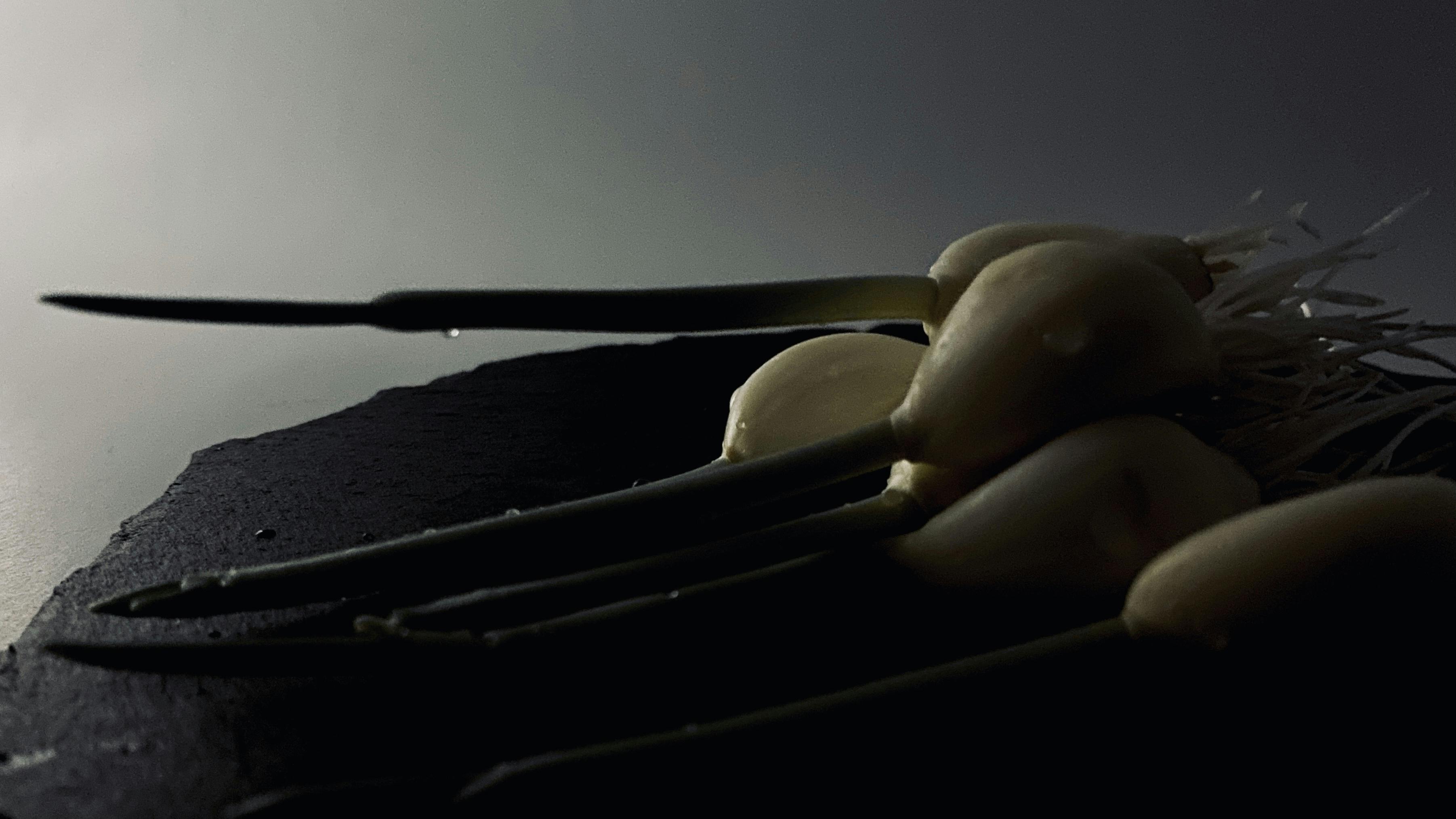 「発芽熟成黒ニンニク」は皮を剥いた生のニンニクを水耕栽培で発芽させ、そこから特許製法で熟成させることで生まれる希少なニンニクです。