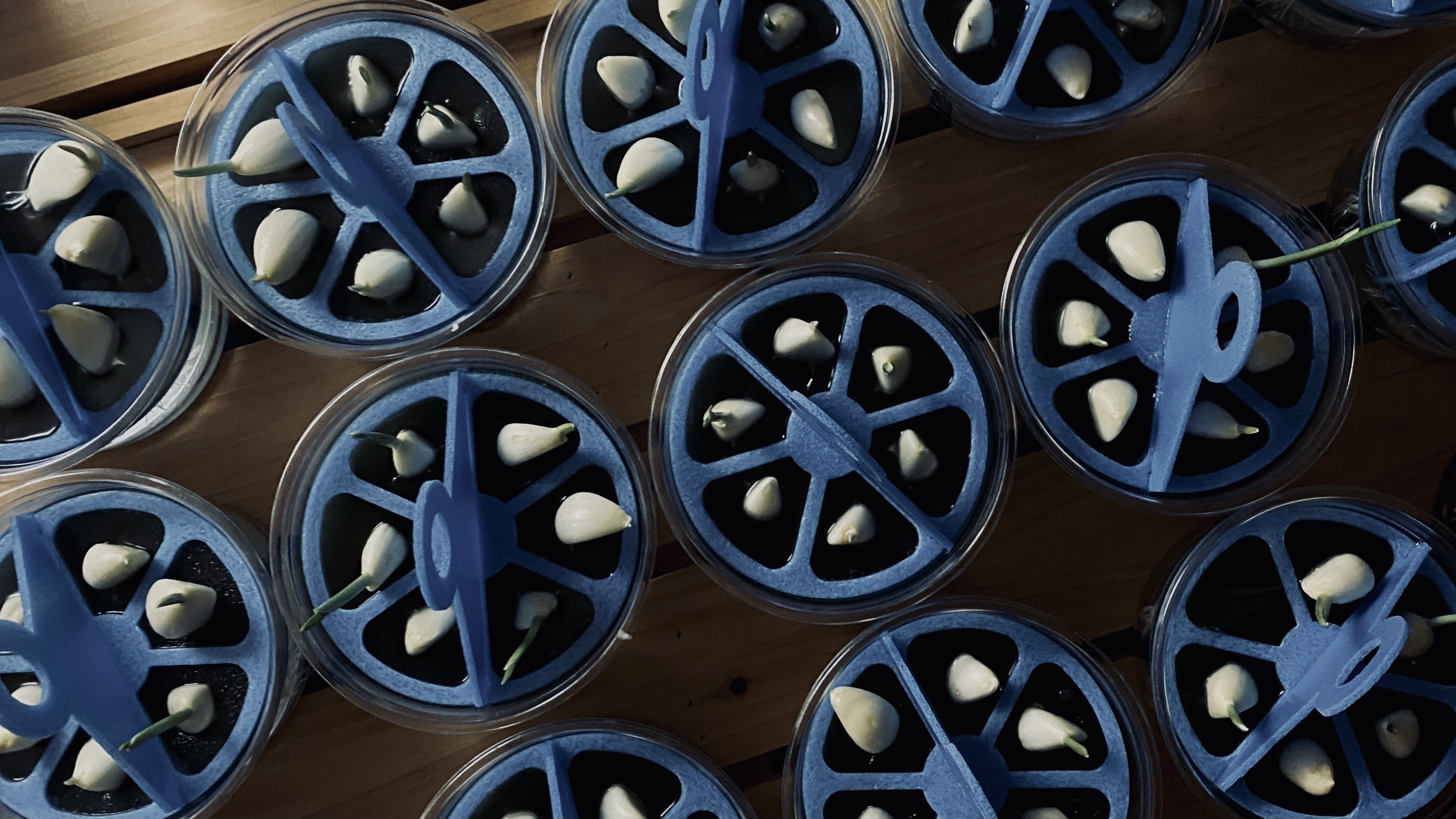 これらの知見を元に、室内で水耕栽培が手軽にできる装置を開発し、日本初となる発芽ニンニクを使った黒ニンニクの製法特許をHirofumiさんは取得しました。