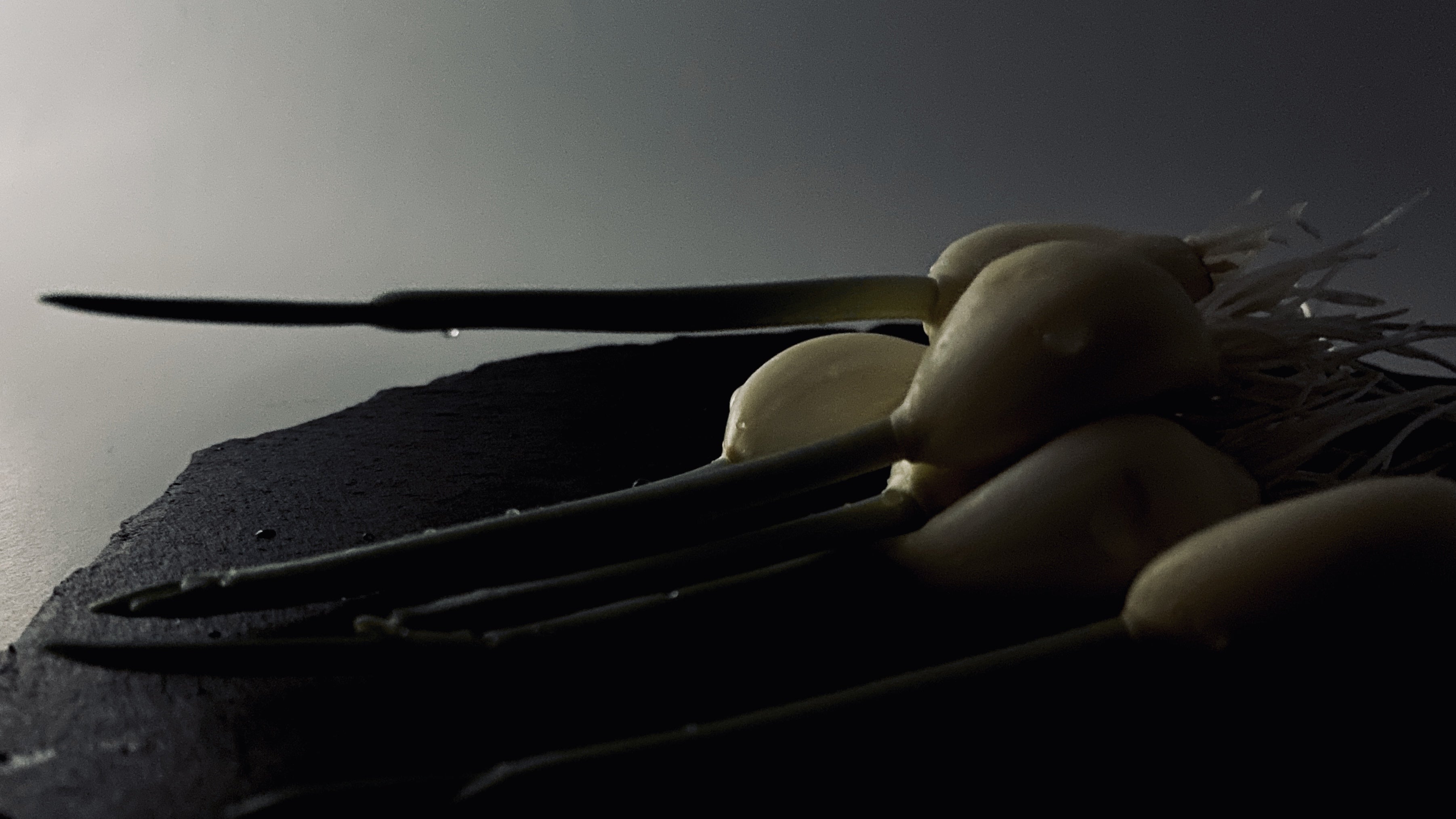 「発芽熟成黒ニンニク」は皮を剥いた生のニンニクを水耕栽培で発芽させ、そこから特許製法で熟成させることで生まれる希少なニンニクです。
