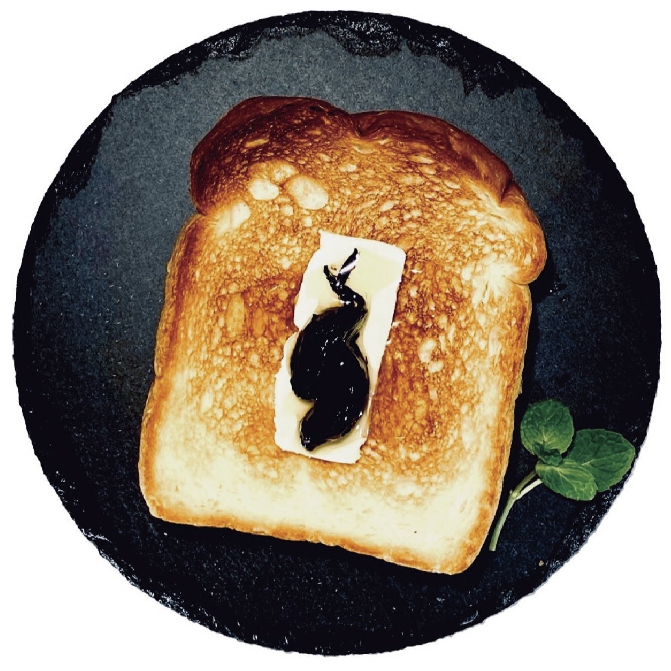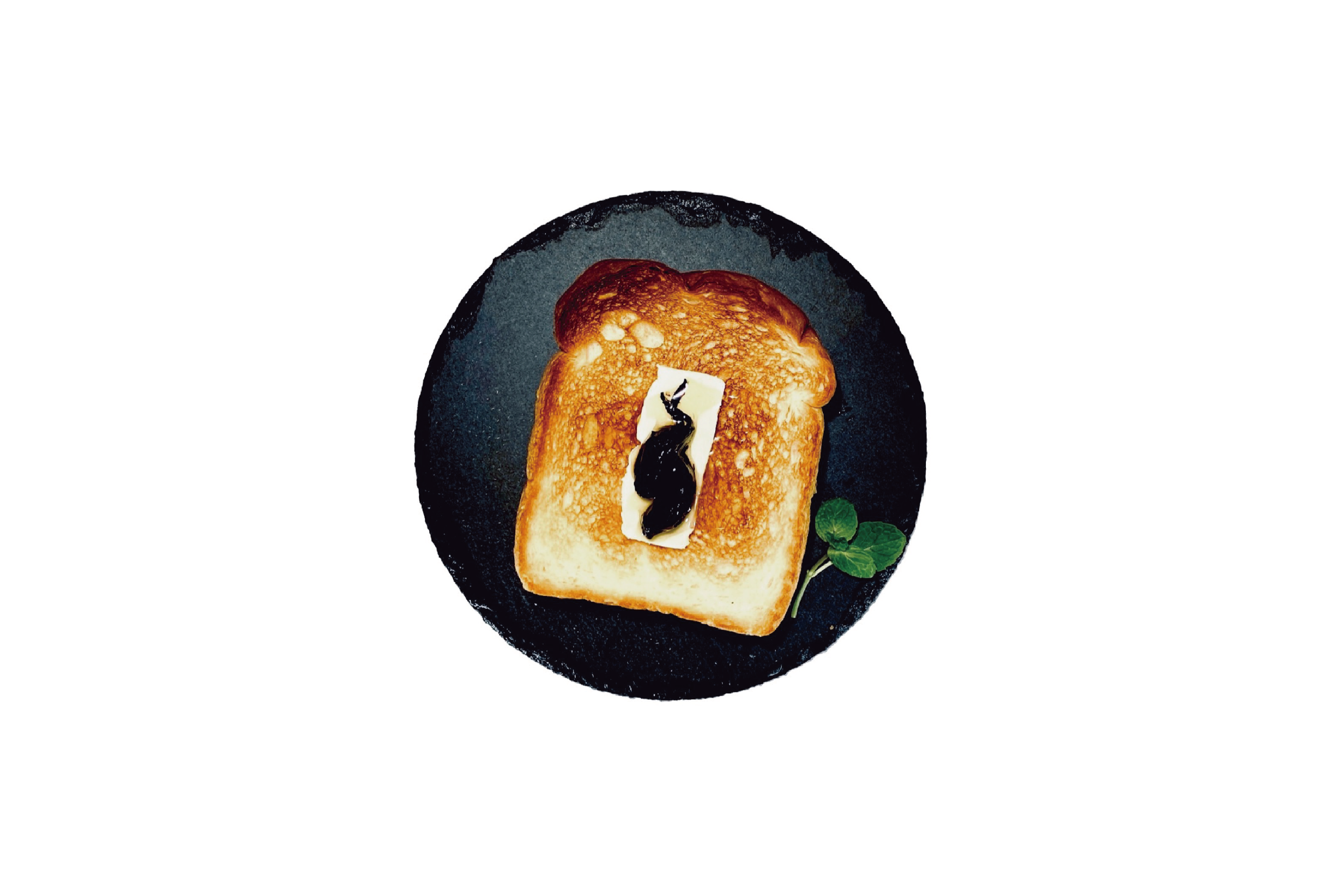 1. 4枚切りの食パンをオーブントースターで焼き目がつくまで焼く。 2. 焼きたて食パンの上にバター(適量)と黄-soak(2粒)をのせて完成。