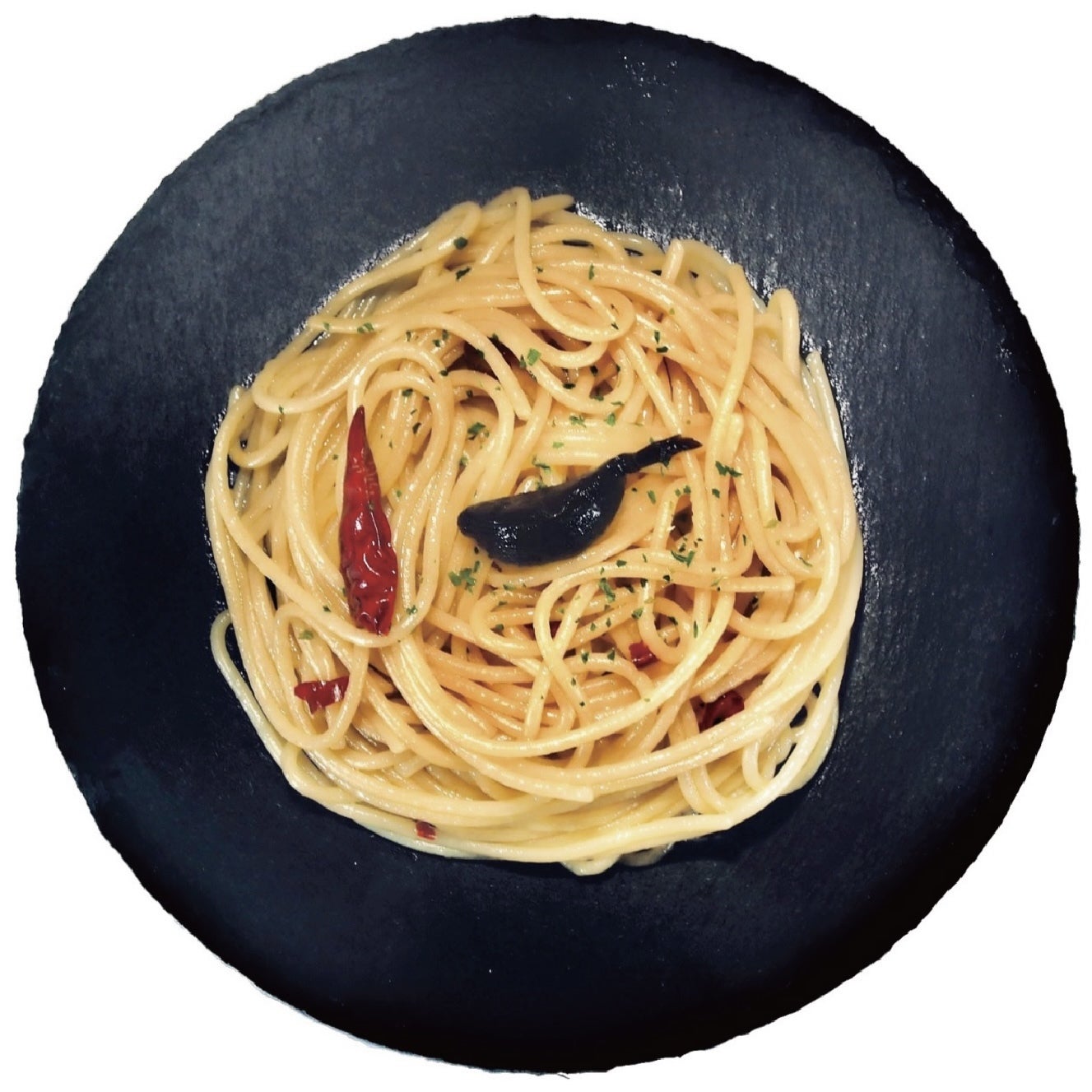 1. 底の厚い鍋に水と塩(100cc=大さじ3)を入れる。 2. お湯が沸騰したら、パスタを茹でる。 3. 茹でている間に唐辛子とニンニクをざく切りする。(唐辛子は種を抜く) 4. フライパンにオリーブオイルを入れ、すぐに唐辛子とニンニクとを入れる。 5. ニンニクがきつね色になったらパスタを入れてあえる。 6. 茹で汁を60cc程度入れてさらにあえる。 7. お皿に盛り付けた後、上にパセリと黒を乗せて完成。