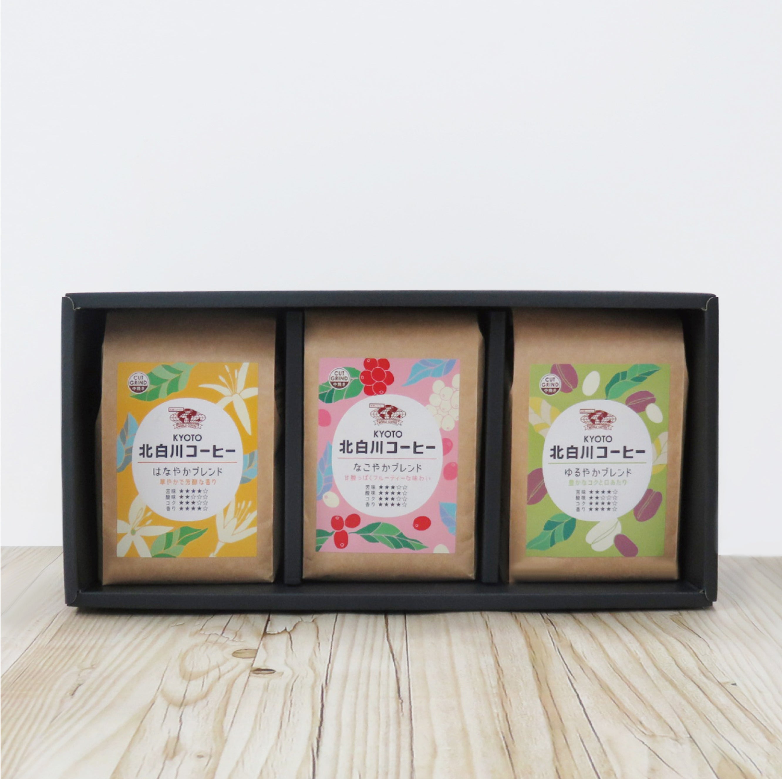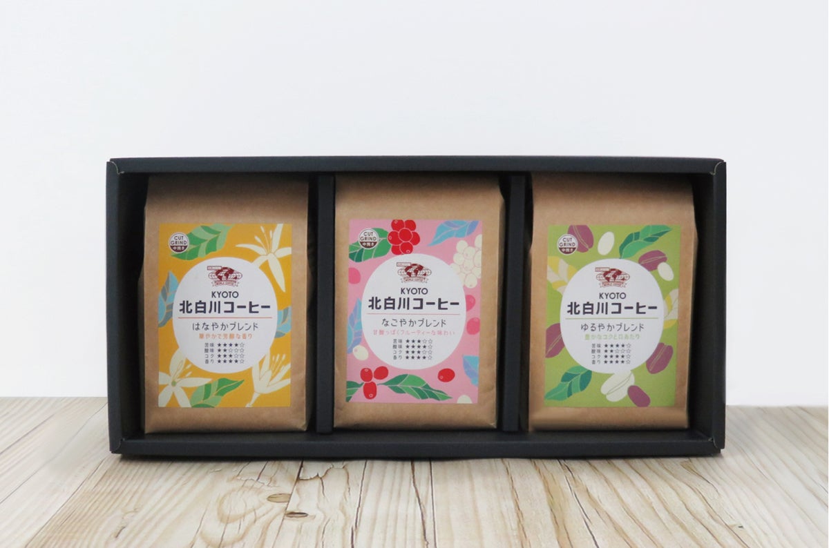 ■北白川コーヒーブレンド3種セット 3,000円(送料込み) - はなやかブレンド、なごやかブレンド、ゆるやかブレンドの3種 箱詰め包装あり