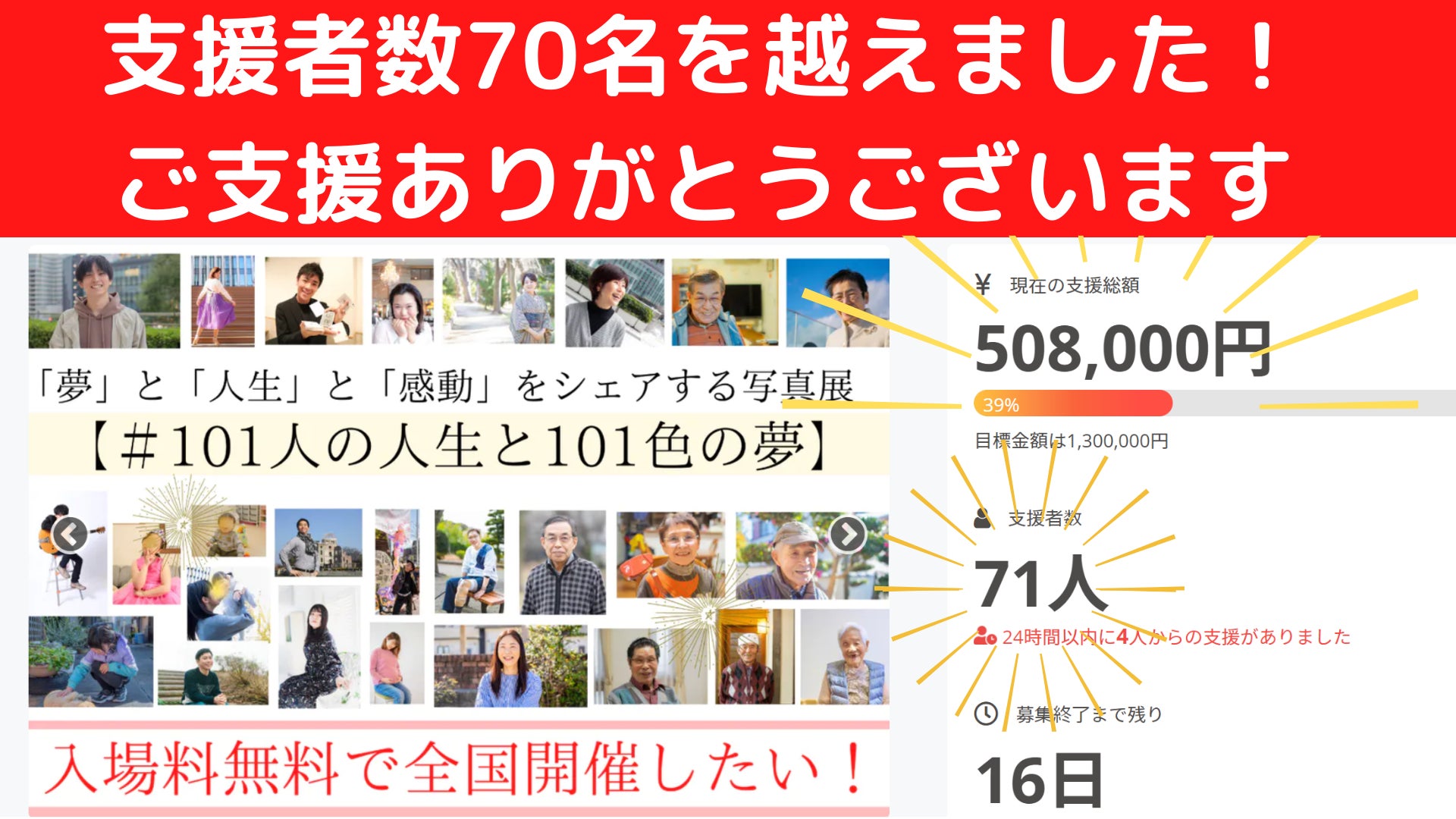 写真展#101人の人生と101色の夢はこれまで大変多くの方々にご支援いただき全国8ヶ所で写真展を開催することや写真集の第1弾を出版することができ、多くの方々に感動とキッカケを届けることができました。写真展運営メンバー一同皆様には感謝の気持ちでいっぱいです。ご支援いただいた皆様、本当にありがとうございます!さて今回の久しぶりの活動報告では、2022年も私たちの活動の拠点である名古屋で写真展を開催しますのでその詳細についてお伝えさせていただきます!0歳から100歳までの101人の方々の夢や人生観に触れることであなたの人生にとってプラスになること間違いなしですのでご都合よければ是非お越し下さい!!入場は無料となっております!!【開催日時】7月9日(土)10:00〜18:007月10日(日)10:00〜17:00※両日とも最終受付は閉場30分前です【会場】ギャラリー矢田 第1展示室(4階)所在地:愛知県名古屋市東区大幸南一丁目1番10号カルポート東アクセス:地下鉄名城線「ナゴヤドーム前矢田」下車 1番出口南へ徒歩5分 駐車場台数81台 料金(1日1回)は、普通自動車300円【料金】入場料無料【2022年の写真展開催スケジュールはこちら】https://q9l9q.hp.peraichi.com