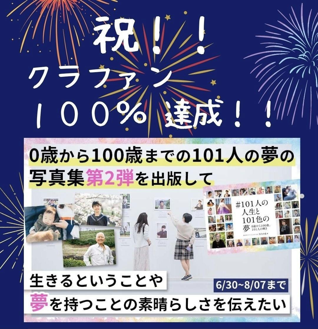 2022/08/03 18:15いつも #101人の人生と101色の夢 の活動を応援いただき、誠にありがとうございます。6月末日より開始しました「写真集 第二弾 出版」のクラウドファンディングにつきまして、皆様よりたくさんの応援・ご支援をいただき、目標の100%を達成させることができました。ご支援ありがとうございました!私たちは早速、写真集第二弾の出版準備に取り掛かっています。手に取って見ていただくことで、写真展の感動を味わっていただけるように、真心込めて写真集を作っていきます。お手元に届くまで、どうか楽しみにお待ちください。これからも引き続き、#101人の人生と101色の夢 の活動の応援をよろしくお願いいたします! もっと見る