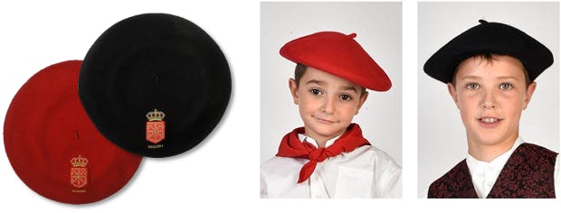 上記のポストカードと赤いハンカチに加えて、標準サイズの赤または黒(お好み)の伝統的パンプローナの無地のベレー帽、または、ナバラ州の紋章/パンプローナの紋章/聖フェルミンのいずれかが配されたベレー帽をお送りします。これらのベレー帽は年間を通して使用でき、パンプローナにお越しいただければ、多くの人が着用しているのを目にすることでしょう。