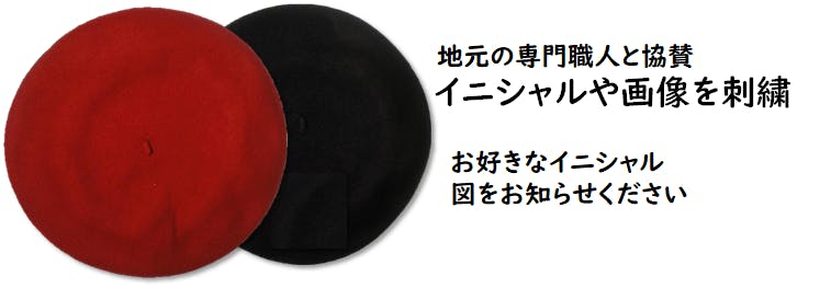 上記のポストカードと赤いハンカチに加えて、赤または黒のカスタマイズベレー帽としてご希望の文字(ローマ字)または画像(画像ファイルをメールでお送りください)を配してお送りします。このベレー帽を専門に製作している地元の職人との協力により、お好みのデザインが刺繍されます。