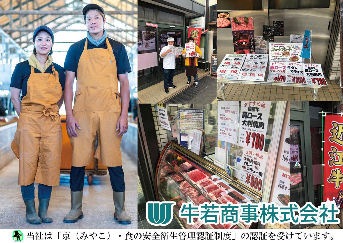 牛若商事は、京都市が制定した「京(みやこ)・食の安全衛生管理認証」を取得し、一流ホテルの厳しいチェックで「OK」をいただいた万全の衛生管理体制で品づくりしております。安全・安心で、新鮮で美味しい高級『近江牛』を食べて応援してください。よろしくお願い申し上げます。