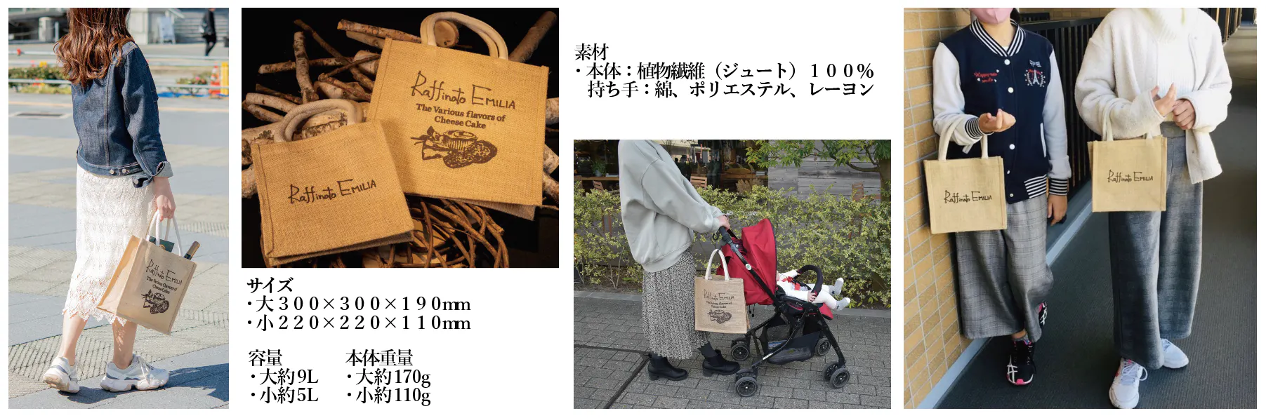 各商品にオリジナルデザインのジュートバックをセットでお渡ししております。