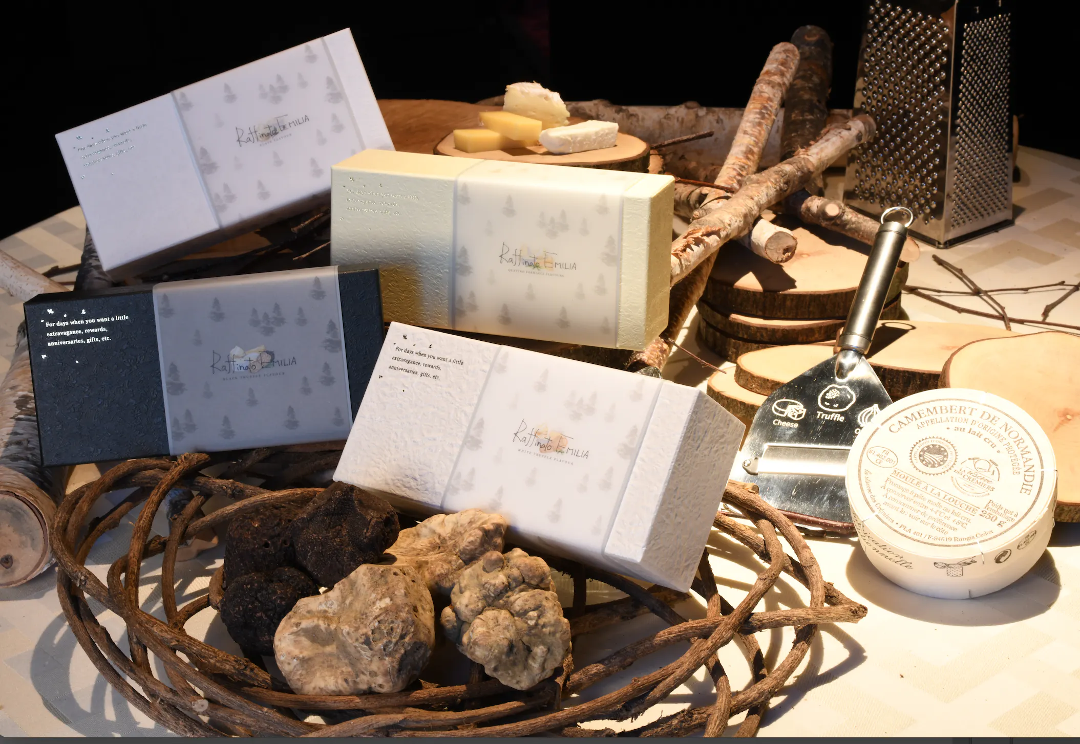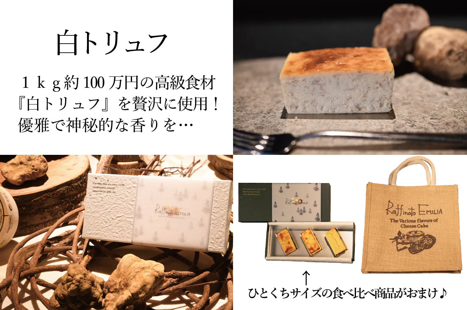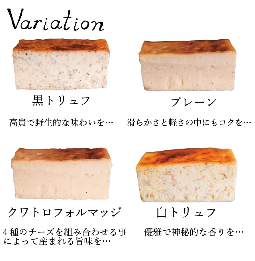 →ひと口サイズのプレーン、クワトロフォルマッジ、黒トリュフを食べ比べできる商品が