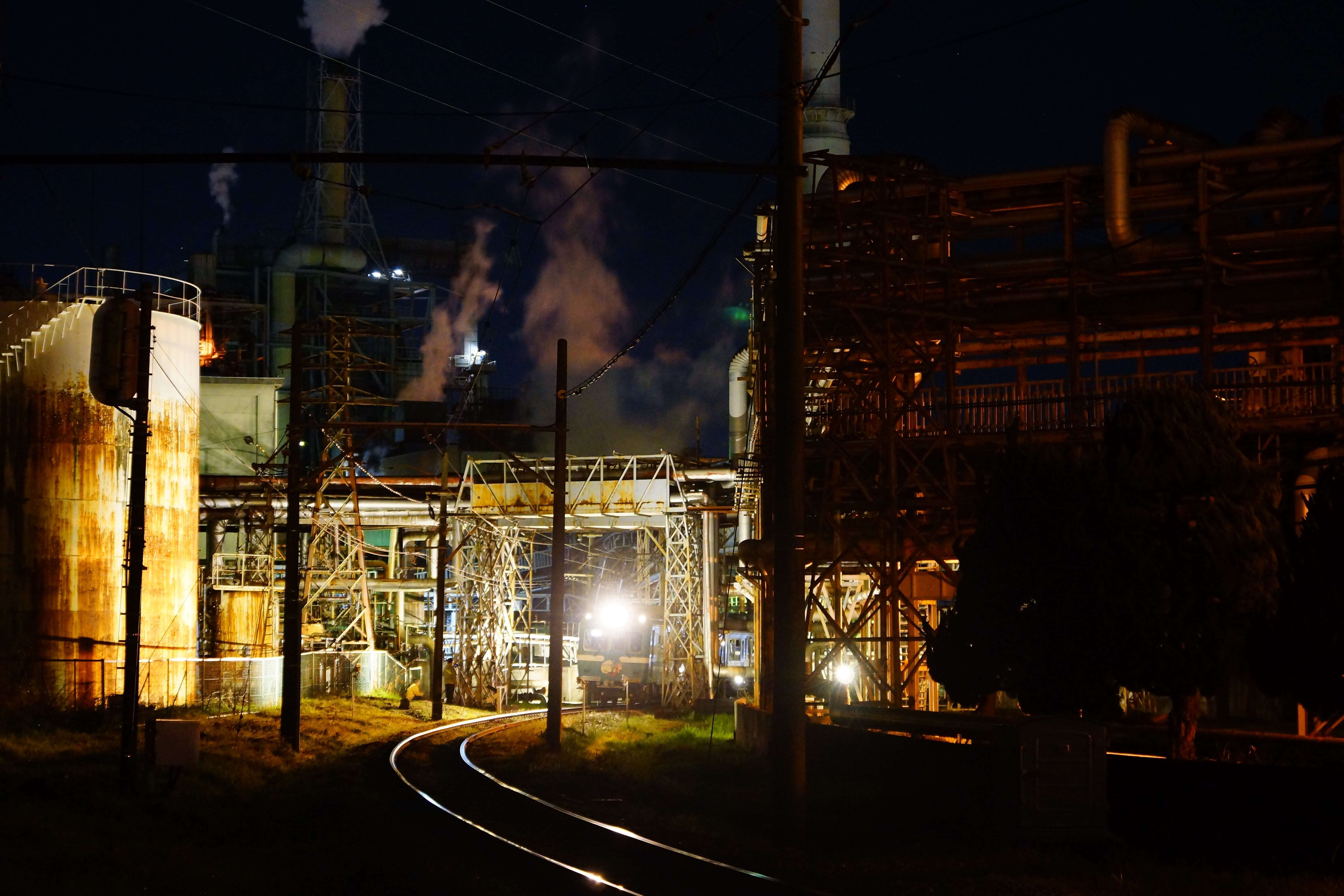 夜には工場の灯りの中を走る夜景電車を運行しています