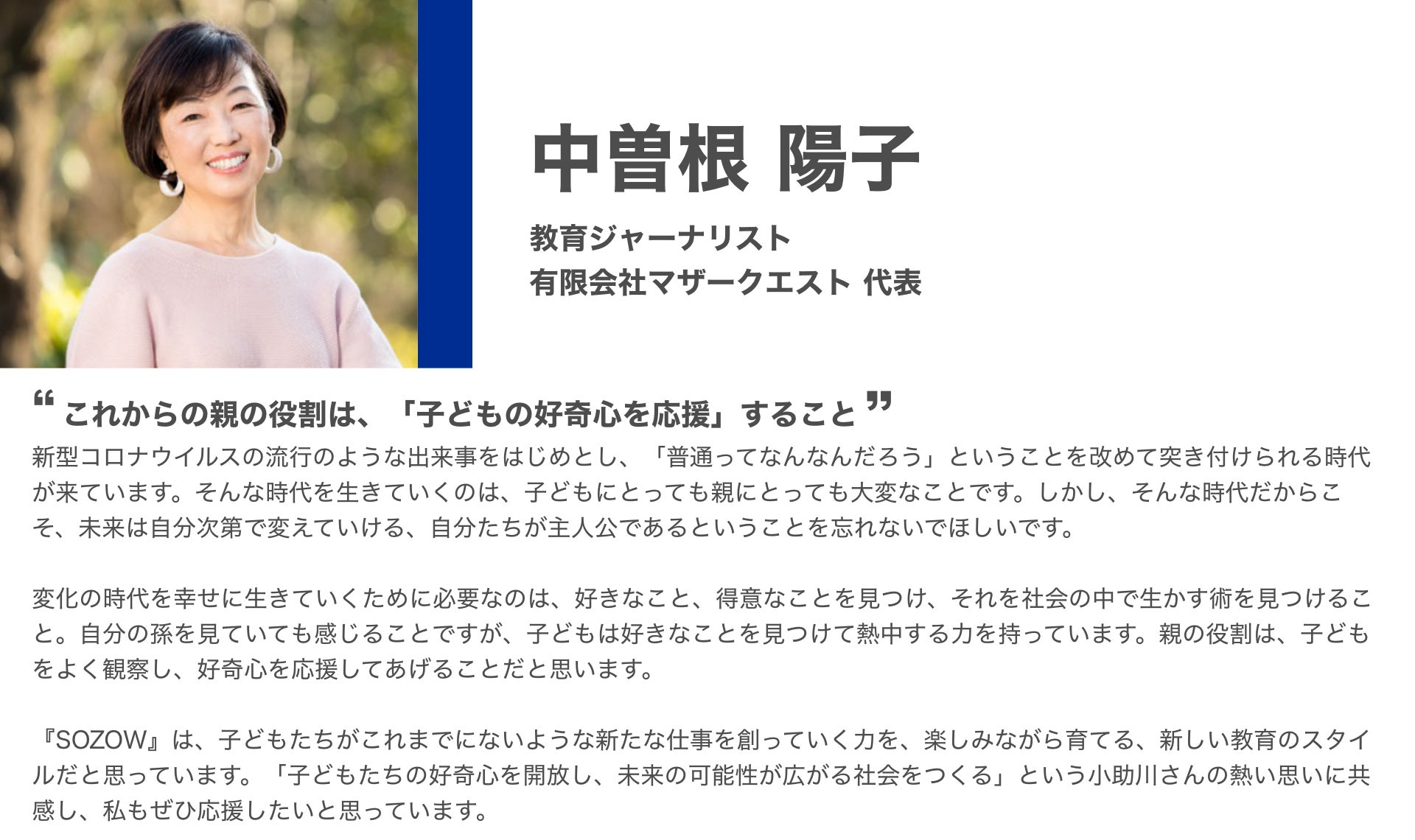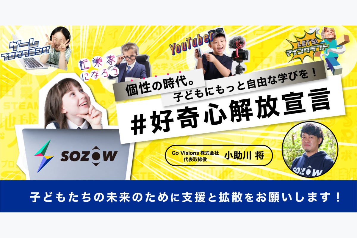 「SOZOW」を通して、子どもひとりひとりが持つ個性に寄り添い、その子ならではの「好き」や「やりたい」を見つけ、育むお手伝いをしていきます。このサービスを一人でも多くの子どもに受けてもらい、自分らしく生きるきっかけを提供したいと考えています。