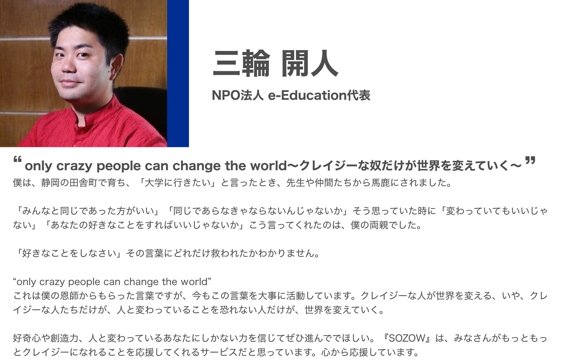 2021/05/16 09:00皆さま、多大なご支援ありがとうございます!SOZOW代表の小助川です。昨日、SOZOWのクラウドファンディングが終了しました。たくさんの応援をいただき、達成することができました。 支援者数: 307名支援総額: 2,488,820円 感謝・感謝です。 ありがとうございます!!ご支援額は、以下へ活用させていただきます。①「SOZOW」「異才レポート(仮)」の専門家監修の強化②「SOZOW」「異才レポート(仮)」のユーザー体験改善③「SOZOW」「異才レポート(仮)」のプログラム強化・新規開発これまで以上に、子どもたちが未来につながる新たな学びを届けていきます。SOZOWの目指す学び実は、私たちは元々はリアルな場で、子どもたちにデジタルものづくり体験を届けるイベント事業を手がけていました。そして、コロナの影響を受けて、ちょうど1年前の5月に、オンラインへ事業転換を決意しました。コロナによって、社会変化のスピードが加速する。そして、必ず画一的教育システムの課題が噴出する。社会から求められる教育のあり方が大きく変わると確信。・子どもが主役、個性を伸ばす学びを社会の当たり前にしたい!・オンラインだからこそ、地域関係なく届けたい!そこからは怒涛の事業づくりに突き進みました。そして、2021年1月にSOZOWをスタートしました。すでに全国や海外からもSOZOWに参加してくれている子どもたちがいます。画一的教育へ当てはまらない子どもたちも、多数参加してくれており、初めて友達ができたり、好きなことで自己肯定感を回復しているという事例も出始めました。 ただ、まだまだ私たちの目指す目標には1%も達していません。クラウドファンディングを行ったのは、まだまだ可能性を否定されたり、個性を潰されそうな環境にいる子どもたち、コロナで激増する不登校などの課題があり、もっと多くの皆さんからチカラを借りたい! チカラを借りなければ、到達が遅れてしまう!という考えがあったためです。これだけの多数のご支援、本当にありがとうございます。ご支援を元に、より事業を前進していきます!3ヶ月後・半年後・1年後、さらにSOZOWは進化を遂げ、多くの子供たちに新たな学びの機会を届けます。必ず!それが皆さんのご支援に応える一番の方法だと考えているからです。今後とも、どうぞSOZOWをよろしくお願いします。Go Visions株式会社 小助川 将(コッシー) もっと見る