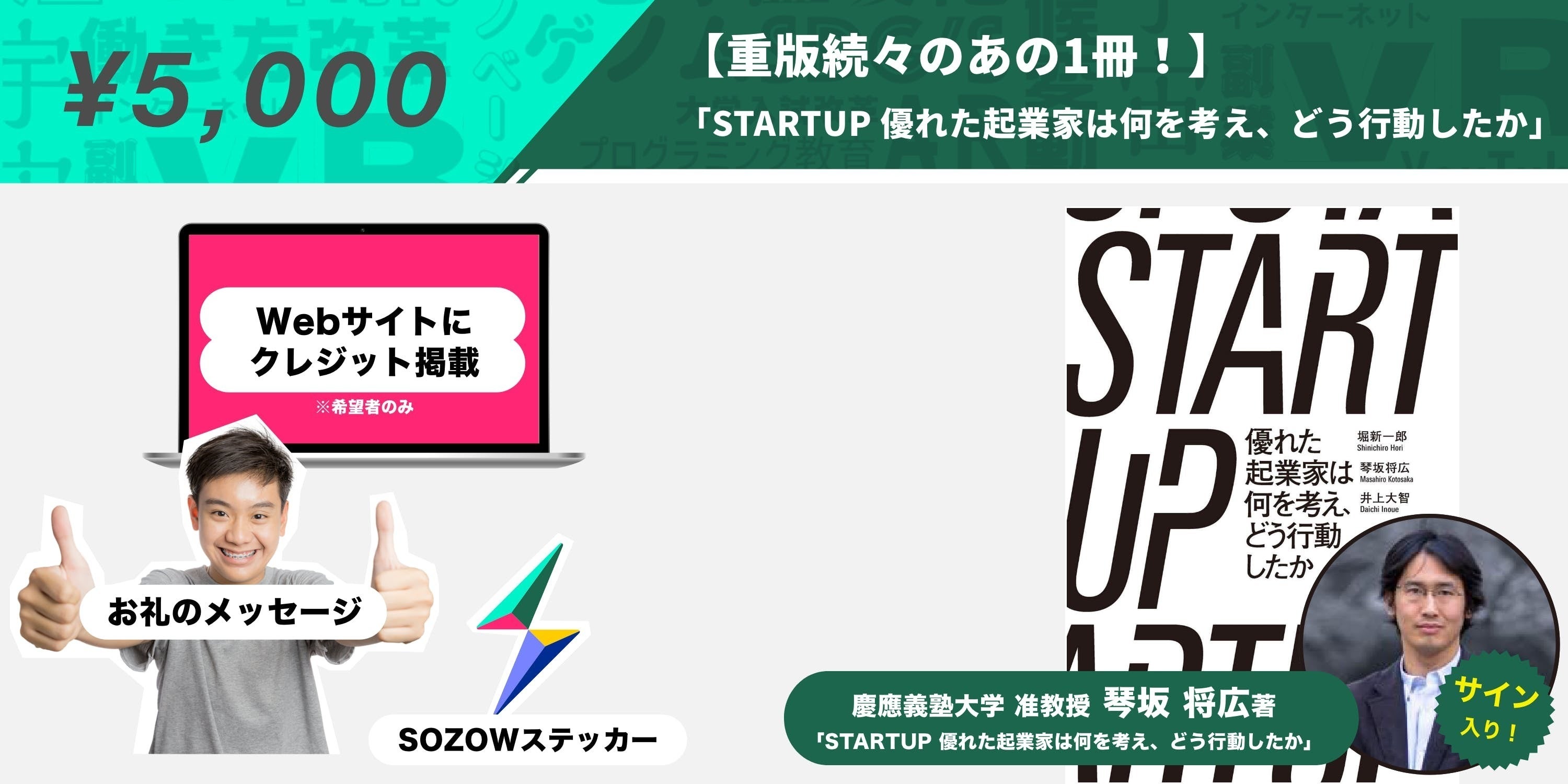 本プロジェクト開始後に即完売(その後10冊限定で追加)となったリターンである琴坂氏の「STARTUP 優れた起業家は何を考え、どう行動したか 」完売への感謝を込め、急遽追加の決まったプレミアムリターンです。「STARTUP 優れた起業家は何を考え、どう行動したか 」と、本人によるメンタリングのセットで限定2枠。クラウドファンディングだからこそ実現できたこの機会、早い者勝ちです!※本はサイン無しとなります。