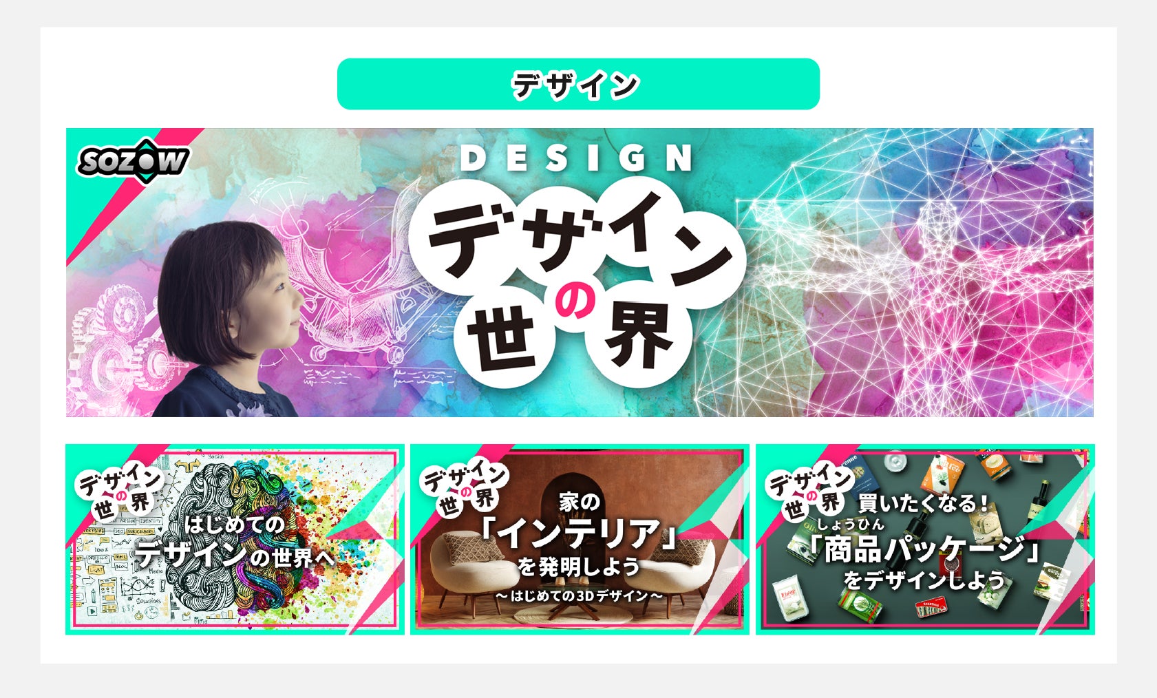 「デザインの世界」シリーズは、世の中のさまざまなテーマ(まちや建物、のりもの、社会課題など)の探求を通して「デザイン思考」の考え方や3Dデザイン・Webデザインに子どもたちと一緒にチャレンジします!