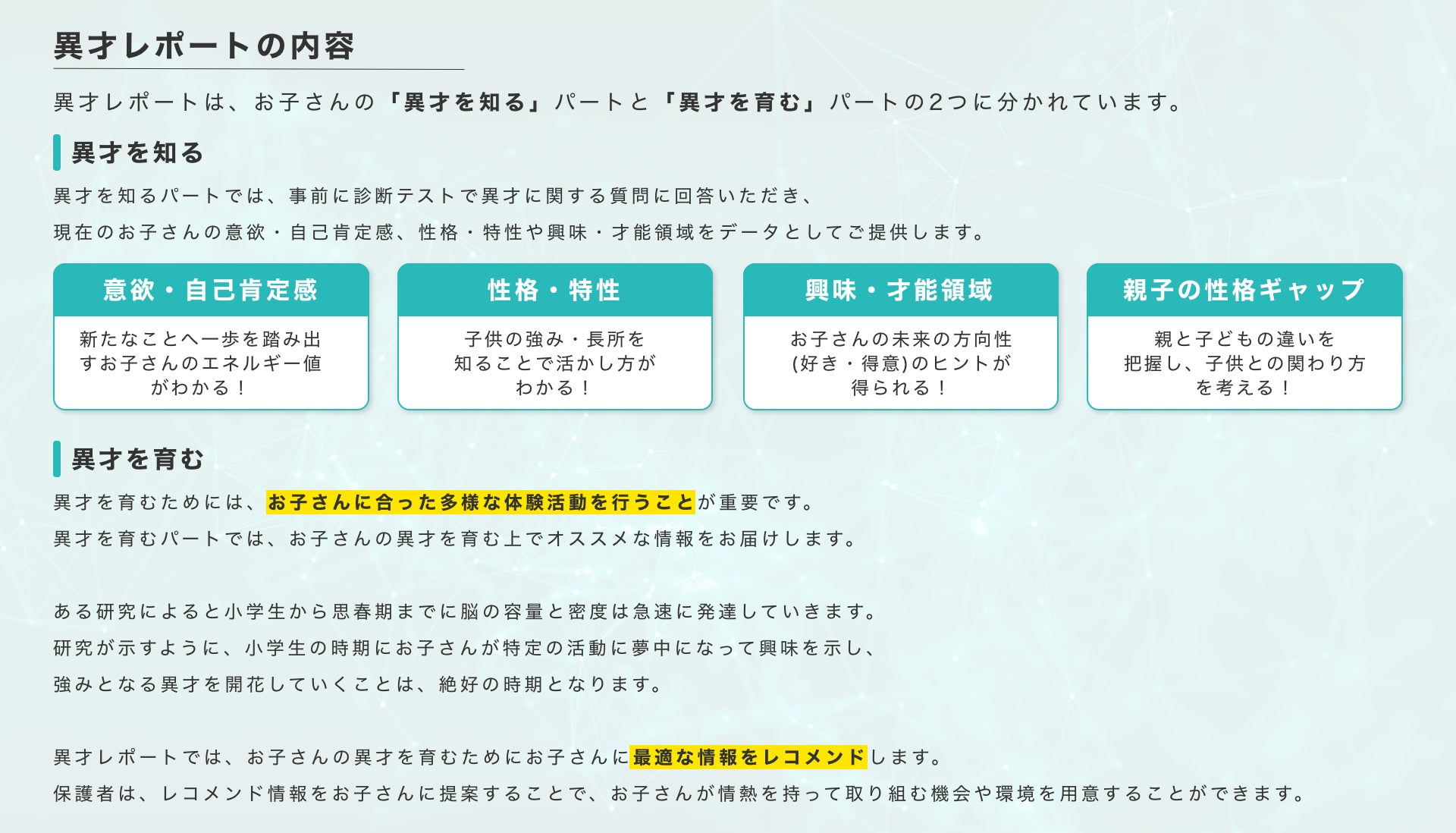 異才レポートでは、お子さんの異才を育むためにお子さんに最適な情報をレコメンドします。保護者は、レコメンド情報をお子さんに提案することで、お子さんが情熱を持って取り組む機会や環境を用意することができます。