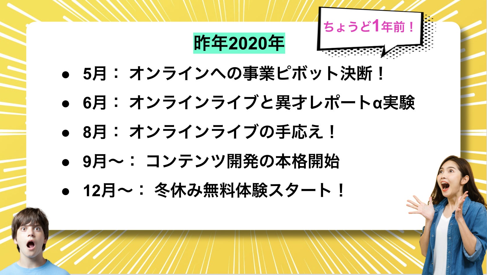 実は、私たちは元々はリアルな場で、子どもたちにデジタルものづくり体験を届けるイベント事業を手がけていました。そして、コロナの影響を受けて、ちょうど1年前の5月に、オンラインへ事業転換を決意しました。