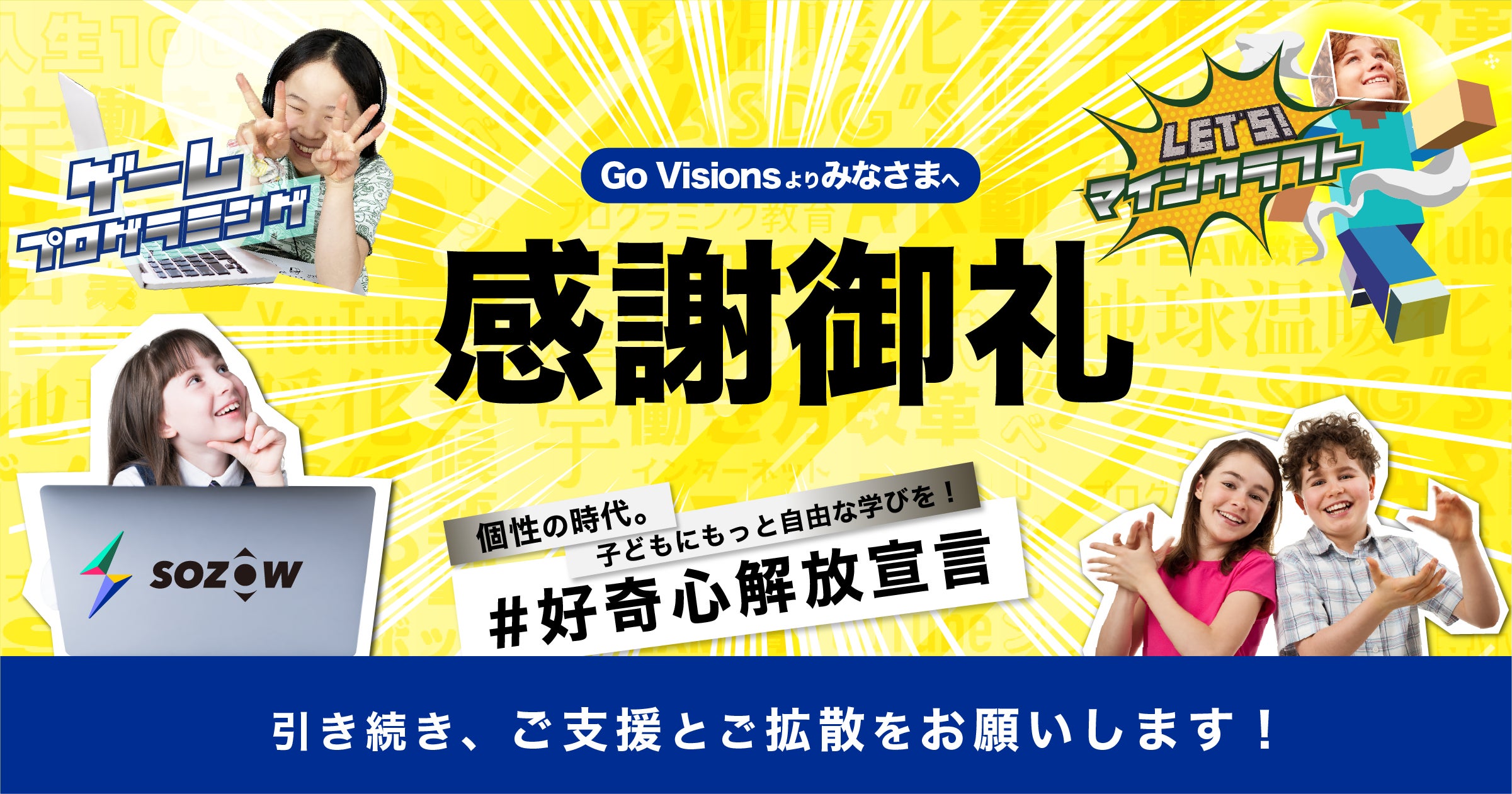 はいはいはい〜!!どもどもども〜〜〜!!「SOZOW」でアクティビティのガイドをしている、Rickyでえええ〜す!!!皆さん、ご支援や温かいメッセージどうもありがとうございますうううううう(T . T)嬉しすぎて、Rickyの目が汗かいてますう〜(T . T)皆さん大好きですううううう!!!そんな訳で、いくで〜!!・・・いきなりやけど、SOZOWターーーーーーイム!!!(SOZOWタイムはみんなで質問や問いについて考える時間やで〜〜)え、なんでいきなりなんって??え〜質問や〜ん(T . T)言うで〜〜〜言うで〜〜〜もうすぐ子どもの日や〜〜ん!!!Rickyなにしよ〜なにしよ〜迷ってんねん〜!!!も〜めちゃめちゃ迷ってま○%×$☆♭#▲!※〜〜〜〜〜!!!!迷いすぎて噛んだやん〜(T . T)噛みぎて、Ricky、口がトマトジュースで溢れてますう〜(T . T)痛〜ピコピコ♪あ、いのちゅーから電話・・・(Go Visionsのいのちゅーね)「はい!お疲れ様ですー!」(Ricky大人ターイム)・・なになに????え????子どもの日に中曽根陽子さんとのイベントがあるって〜〜〜??これやって〜!え〜!!!めっちゃいいやん〜〜〜〜〜子どもの日に子どもの教育について考える・・最高や(T . T)しかも今回来てくれはる中曽根さんってめっちゃすごい人やん〜〜〜!!これは行くしかないやん・・・お申し込みはここからできるねんて!!!これはもう、張り切って、張り切って、はRickyって、申し込も〜〜〜〜〜!!!と!!いうわけで!!今日はここまで!!さみし〜!さみし〜!みんな、Rickyのこと覚えといてや〜!ばいば〜〜い!!!Go Visions株式会社 SOZOWガイド Ricky