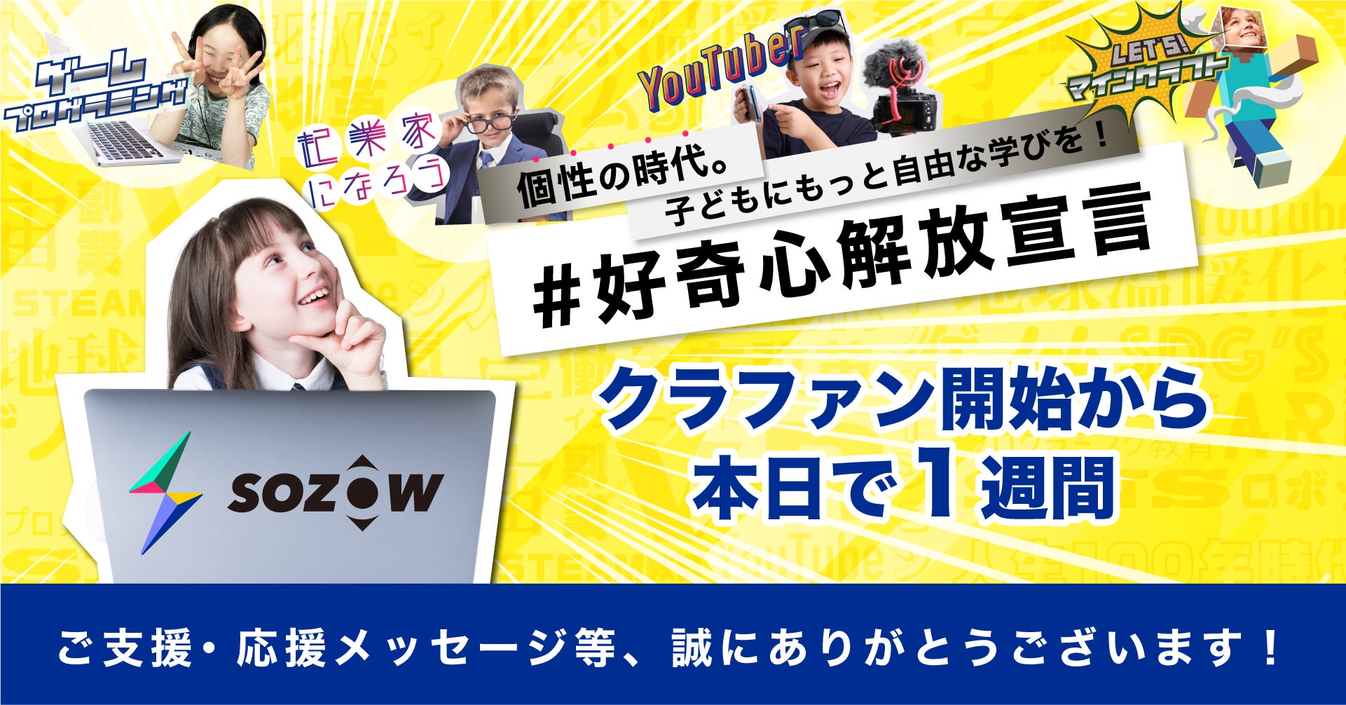 はじめまして。私、Go Visions株式会社のぷりもえと申します!本日で、クラファンがスタートしてから、ちょうど1週間が経ちました。現在、なんと・・・・!97名の支援者の方々から、694,160円のご支援をいただいております!感激です・・・。本当に、ありがとうございます!ご支援とともに、暖かい応援メッセージをたくさんいただいております。重ねて、感謝を申し上げます。みなさまから応援メッセージを拝見すると、暖かいメッセージと、「こんなサービス欲しかった!」との声がありました。とっても、わかります。私もその一人です!現在私は、Go Visionsにて、主にデザイナーやコンテンツの企画を中心に携わらせていただいております。(デザインでは、特に新聞広告や、オンラインライブのスライド、今回のクラファンページのデザインを担っております)(↑私が作っています)私自身、中高時代、集団無視などで不登校を経験しました。当時は単純にその状況が辛いと思っていたのですが、要素を分解してみれば、「好きなものを好きと言えない(言うことを許されない)環境」が私にとって最悪の環境だったと言えます。不登校でも、成績は悪い方ではありませんでした。先生には”いい点数”を取ると褒めてもらっていました。しかし、私の肯定感は上がらなかったんです。それは、自分の好きなものや興味のあることではなかったからです。「もっと個性を曝け出した分野で輝きたい」「好きなものを自信を持って好きと言いたい」そんな思いを強く抱き、もどかしさのまま中高時代をおくりました。しかし、運がいいことに、大学生、そして現在の社会人においては、驚くほどに好奇心のままに活動をさせていただいております。(現在デザインに携わっているのも、私の好奇心です!)それゆえに、中高時代に失った肯定感はみるみる向上し、今は心から「主役は、私だ」と言える胸を張った人生を歩めています。と、同時に、もっと早いうちから、自分の”好き”や好奇心に何の障害もなく素直に足を運ばせ、自分自身の個性に自信を持てるような環境があったらどんなによかっただろうと、強く思いました。そこで、現在は、Go Visionsにて、「SOZOW」というサービスを通し、子どもの好奇心や個性を育むことに全力を注いでいます。(毎回、子どものアウトプットやそれに対しての思いなどを見ると、子どもの可能性は無限大だと感じます)そしてそして、私も子どもと一緒に、好奇心と個性のままに成長していきたいと思っております!みなさん、今後とも、よろしくお願いいたします!Go Visions株式会社 桑原萌(ぷりもえ)