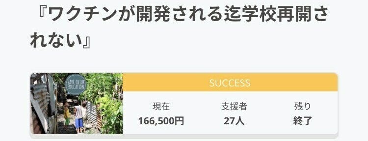 2021/05/05 09:00おはようございます。本日目標金額を達成することが叶いました。昨日100,000円総支援額と成りました、近日中に今回の支援金で購入予定の文房具を配布する予定の貧困街に住む方達にこの事を報告しに行きたいと思います。また今後も支援額が増えた場合には1人でも多くの子供達に文房具を届けられ様にしてまいりたいと思います。支援者の皆様に改めて感謝を致します。西野祥成 もっと見る