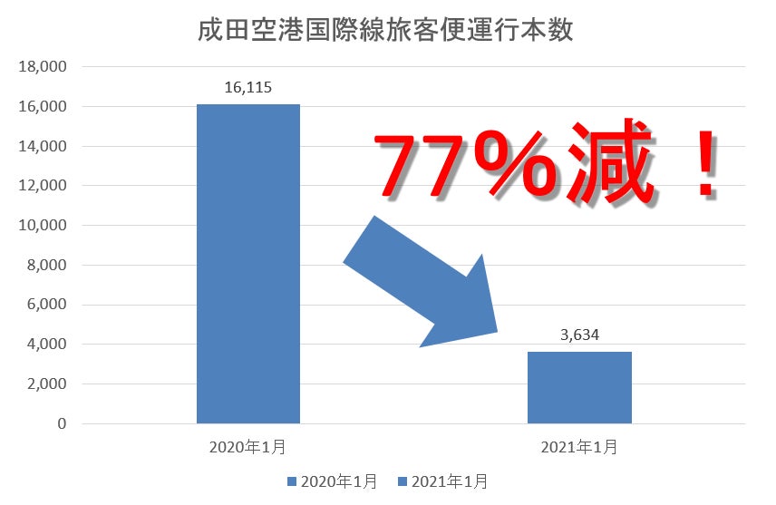 しかし、コロナ禍で2021年1月の成田空港国際線旅客便は運行本数3,634本と、前年同月の16,115本と比較すると約77%減というのが現状です。