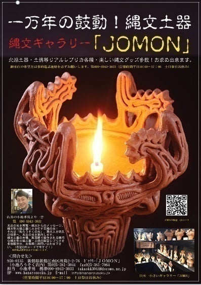 2020年の東京オリンピックは50年ぶりの日本開催の為に、ここでもさらに火焔土器の聖火台を!の声が再発し、新潟県では信濃川火焔街道として連帯してこの運動が盛んになる。そこで2019年その勢いのまま縄文土器専門店「縄文ギャラリーJOMON」がOPEN。土器職人も火焔土器づくりに奮闘。がしかし、2020年の東京オリンピックの火焔土器の聖火台の話は流れ、コロナ渦に巻き込まれ開催は延期、これには関係者も意気消沈。土器職人の丹精込めた火焔土器は現在ひっそりと20個前後が、倉庫で息を潜んで待機しています。私は、縄文土器を愛する皆さんの手元に届いて土器職人の笑顔が見たいと願うばかりです。