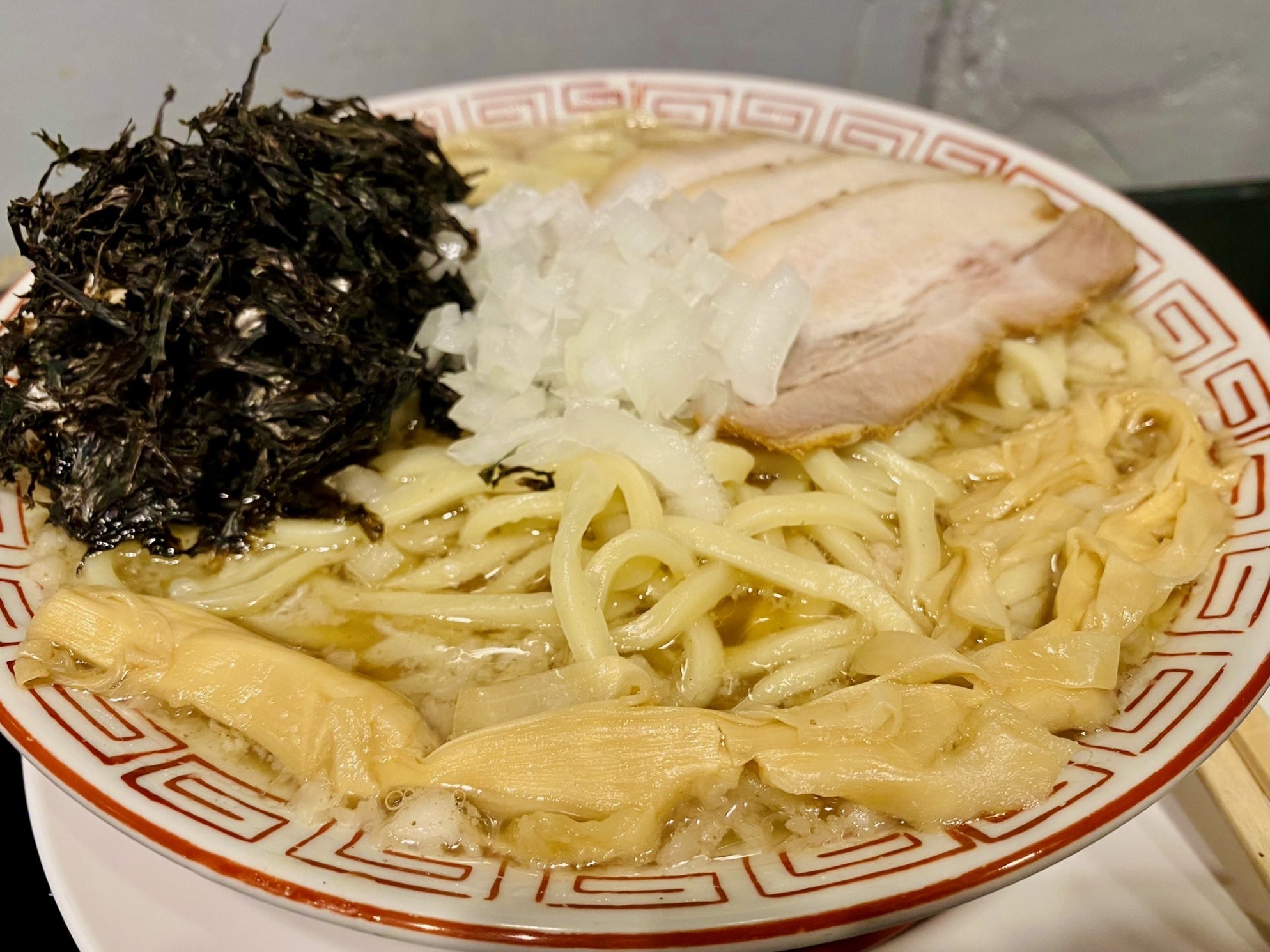 煮干し出汁の効いた醤油豚骨スープに絡む自家製太麺。特製の背脂の上にとろけるチャーシューとほぐれる食感のやわらぎメンマ、薬味には刻んだ玉ねぎをふんだんに。