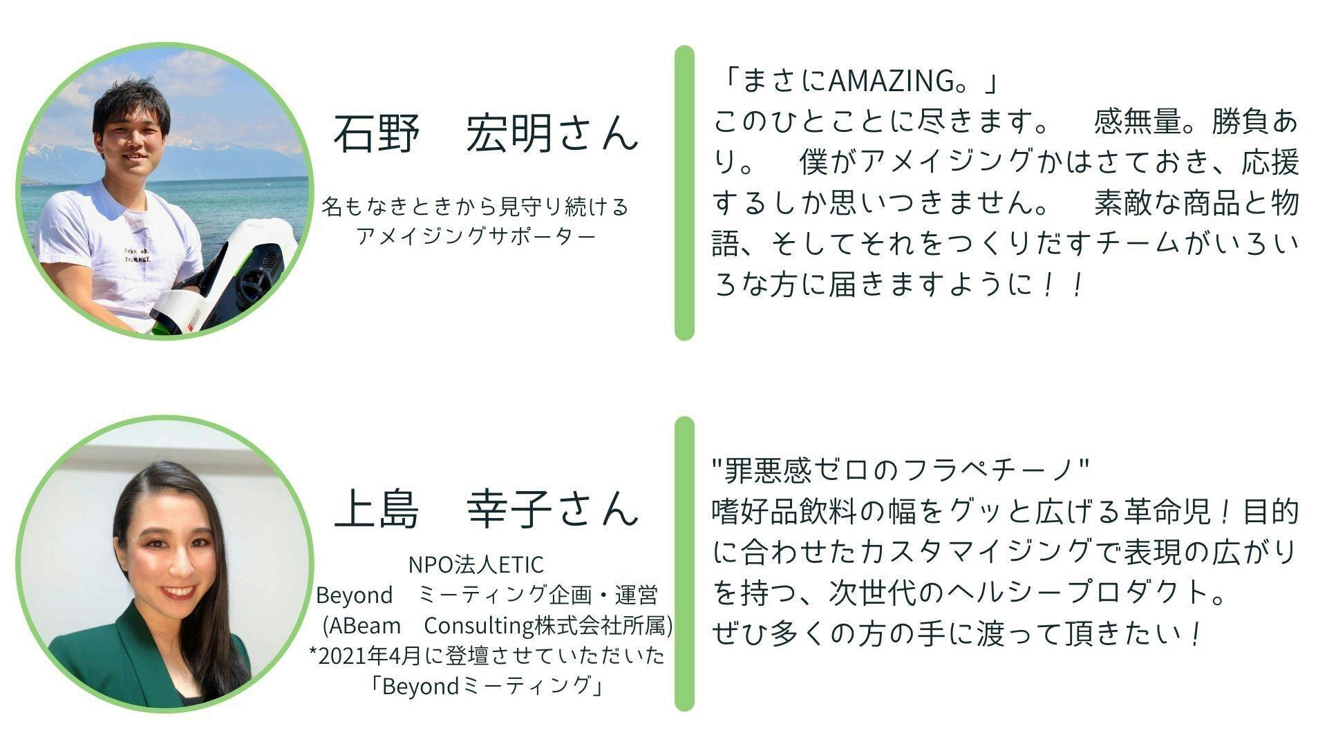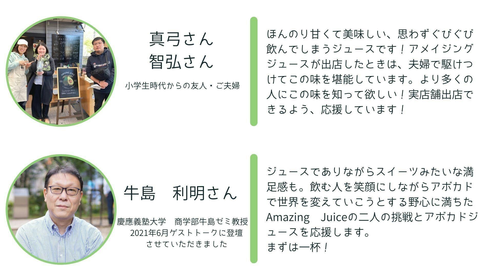 2021/07/29 11:197月28日(水)を以て、35日間のクラウドファンディングを無事、完遂することができました。温かく応援してくださり、本当に、本当に、本当にありがとうございました!!!!感謝しても感謝しきれない!!!と感じております。総計:1,613,354円、支援者292名のご支援をいただきました達成すら危ぶまれた状況でしたが、みなさんの応援の声が、何よりもパワーになり、もう一波、さらにもう一波と、進めることができ、ネクストゴールであった150万円をも超える結果となりました!<今後の流れ>改めて、お一人おひとりにお礼のご連絡と、リターンのお知らせをさせていただきます。・早急にリターンの商品開発を進め・予定日を目標に、リターンの準備をさせていただきます。・物件調査を進め、マッチする物件と出会った時に、皆様からいただいた資金で物件の確保を行って参ります。これからも一つひとつ、ハードルを超えていきながら、常設店に向けて進めていき、・店舗作りから愛されるお店・お店だけではなく、自宅からアボカドジュースを楽しんでいただける仕組みづくりを進めていきたいと思います。随時、進捗のご報告をさせていただきますので、その過程もぜひ楽しんでいただけたら幸いです。<東京・目白で毎週日曜日に出店中>また、現在、東京・目白「baba kitchen」にて、毎週日曜日に定期出店を行っております。アボカドジュースを楽しんでいただいたり、繋がり作りも試しながら、その取り組みも今後の店舗運営に活かして参りたいと思います。お近くに来た際は、ぜひお立ち寄りいただき、皆様とお会いしたり、お礼の言葉を伝えさせていただけたら幸いです。▼出店情報https://sites.google.com/view/amazingjuice/出店日アクセス*クラウドファンディングは終了しましたが、支援しそびれた!という声もたくさんいただきました。クラウドファンディングに掲載していたリターンは、通常取り扱ってないものが多くあるため、もし気になった商品があれば、個別に対応させていただきます。ご連絡をお待ちしております。それでは、また新たな挑戦を続けて参ります!皆様には、「応援してよかった」と思っていただけるよう、今後のAMAING JUICEの姿を、引き続き見守っていただければ幸いです。今後とも、応援を、宜しくお願い致します!2021.07.29 AMAZING JUICE_______________________AMAZING JUICEホームページhttps://sites.google.com/view/amazingjuice/公式instagramhttps://www.instagram.com/amazing.juice.avocado公式facebookhttps://www.facebook.com/amazing.juice.avocado公式twitterhttps://twitter.com/amazing_juice もっと見る