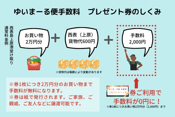 また、券は譲渡可能。「自分でお得に使いたい」「島に住むおじーにプレゼントしたい」「買い物に困っている友達にオススメしたい」などなど…。自由に使っていただけるお得なプレゼント券をぜひご活用下さい。
