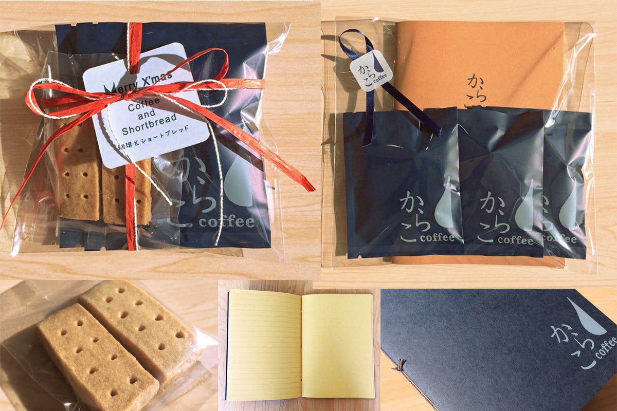からこcoffeeのグッズもつくってギフトセットにしたいねと、みんなで話し合いや研究を重ねて、ついにからこcoffeeではじめてのグッズ『からこノート』とはじめての焼菓子『ショートブレッド』が完成!クリスマスシーズン限定で『ジンジャークッキー』も焼きました。