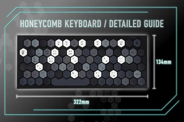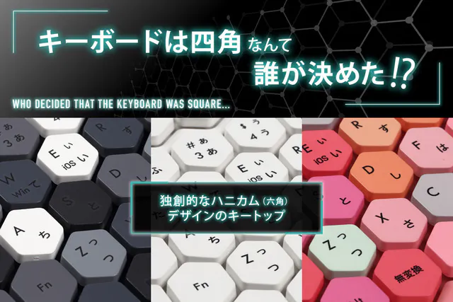一般的なキーボードのキートップは四角や丸ですが、本プロダクトは他では一切見かけないハニカム形状(六角形)を採用しています。