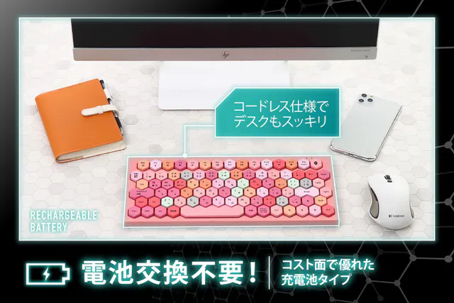無線接続と伴って完全なコードレス仕様ですので、デスク周りの邪魔な配線を減らす事ができ、快適な作業空間を確保できます。