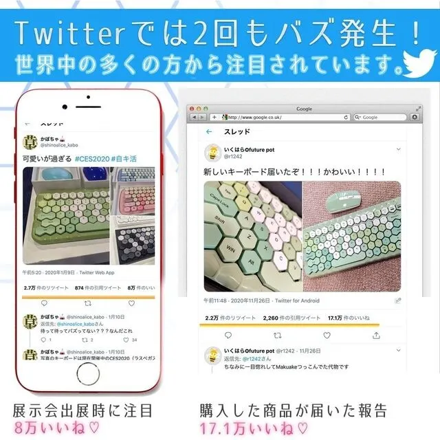 初めて注目されたのは2020年ラスベガスでの展示会でしたが、実はハニーカラフル以外のハニカム型キーボードを気にされている方も多く、Twitter上でも「心待ちにしている!」と多くのコメントをいただいた事を受け、この度リリースします!