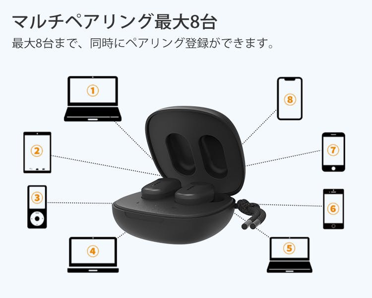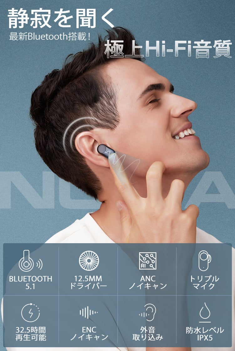 それに加え、業界最大レベルの12.5mmダイナミックドライバー+専門技術で立体的なHi-Fi音質を実現。その他、IPX5の防水レベル、外音取り込みモード、タッチコントロール、オートペアリング機能等、生活を豊かにする工夫が盛りだくさん。再生時間もこまめな充電を必要としない、最大32.5時間再生で快適さをプラス!