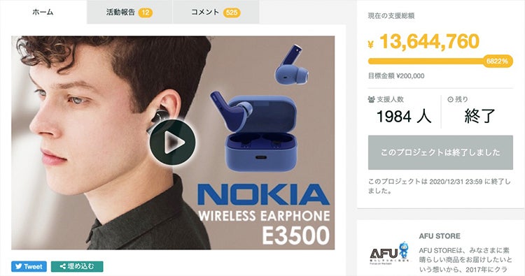 大好評だった完全ワイヤレスイヤホン第一弾「NOKIA E3500」は、約2000人のご支援者様より合計1,300万円以上を集め、NOKIAメーカーの日本市場での始動のキッカケを作り出しました。