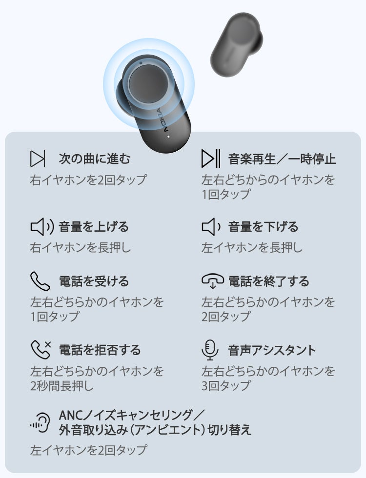 イヤホン上部の丸い部分に触れることで、音楽や通話を操作するスマートタッチコントロール式。ワイヤレスイヤホンデビューの方でも安心のシンプル操作こそ、“NOKIA”が手掛けるイヤホンの特長です。