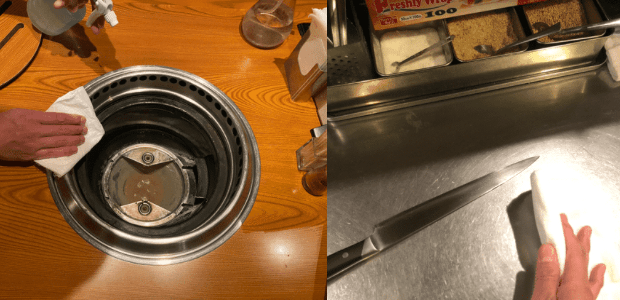 A4:通常の拭き取りであれば、水のみのすすぎで洗い流すことが可能です。油などの汚れがあった際は少量の中性洗剤を使用し、すすいでください。