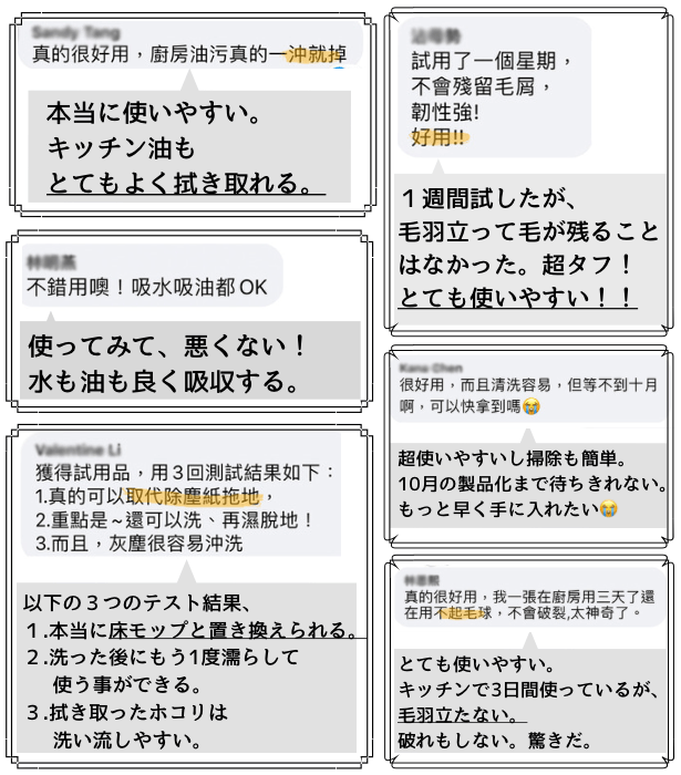 ■Idea Homは20年間に渡り家事用品に特化し販売を続け、これまでに多くのお客さまにご愛用いただいてきた実績があります。そんなIdea Homが3年間もの歳月をかけ、主婦や評論家(約300人)に実際に試用してもらいながら、試行錯誤の末に「Cloth Paper」を開発しました!
